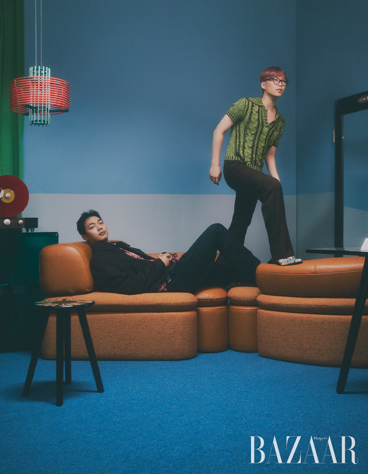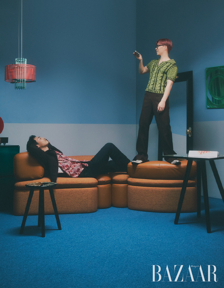 아닐린 돌체 브라운 컬러 가죽과 오렌지 컬러 패브릭이 콤비로 조화를 이루는 돌체브라운 컬러 슈크르 소파는 스툴 포함 4백만원대 Jakomo. 임재린 재킷은 Tonywack, 셔츠는 Vass, 바지와 신발은 개인 소장품. 이찬혁 니트는 Cerric, 팬츠는 Vass, 부츠는 Humant, 안경은 Fendi by DK Eyewear.