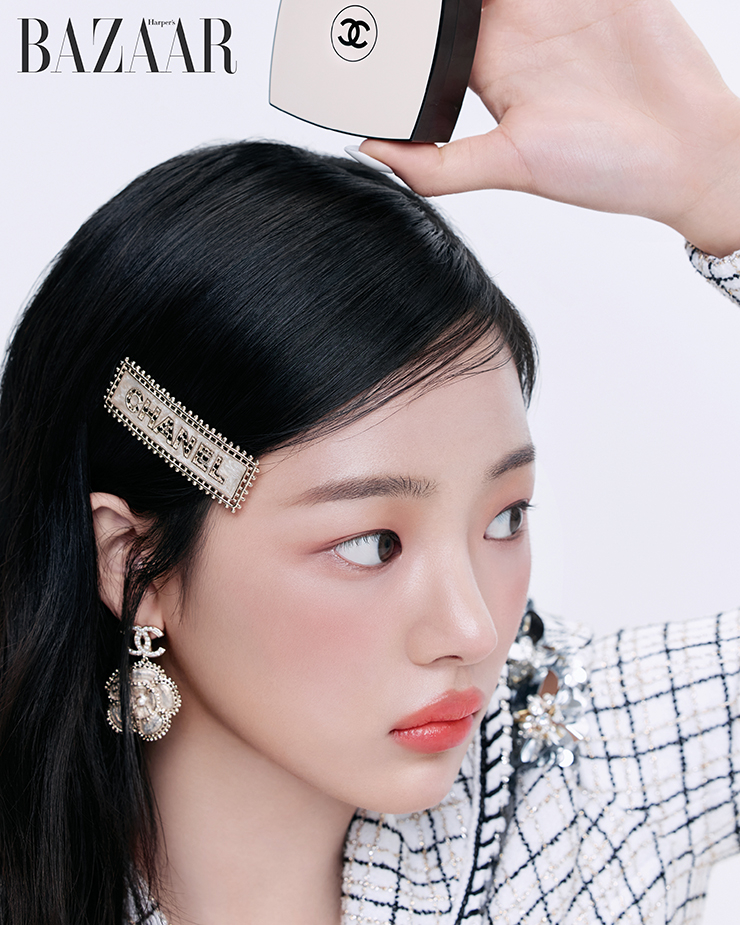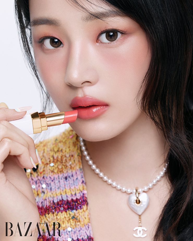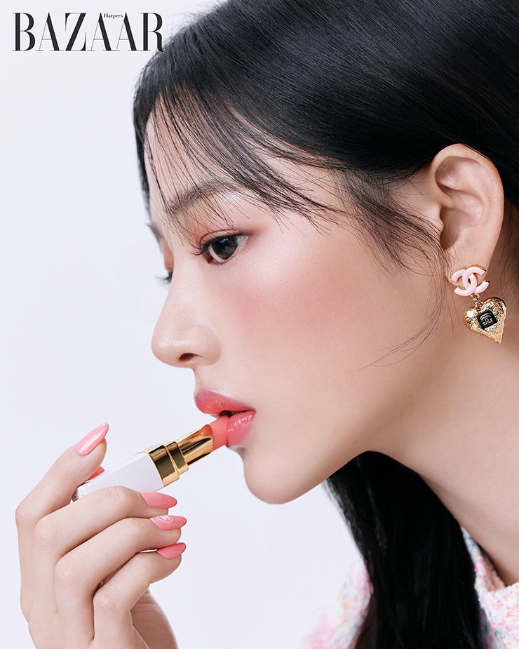 ‘레 베쥬 헬시 윈터 글로우 프라이머’ 프로스티 화이트와 아이시 베이지를 섞어 발라 피부에 윤기를 입히고 ‘레 베쥬 헬시 글로우 모이스처라이징 파운데이션’으로 윤광 베이스를 완성한다. 프레시 핑크 컬러 ‘레 베쥬 헬시 윈터 글로우 블러셔’ 로즈 폴레를 광대뼈부터 콧등까지 가로로 발라 꽃잎에 물든 듯 색을 입혔다. 눈가는 ‘레 베쥬 헬시 글로우 내추럴 아이섀도우 팔레트’ 쿨의 5가지 컬러를 쌍꺼풀 라인과 애굣살을 중심으로 레이어드해 화사함을 더했다. 입술엔 민지가 들고 있는 ‘루쥬 코코 밤’ 918 마이 로즈를 발라 장미빛을 입혔다.