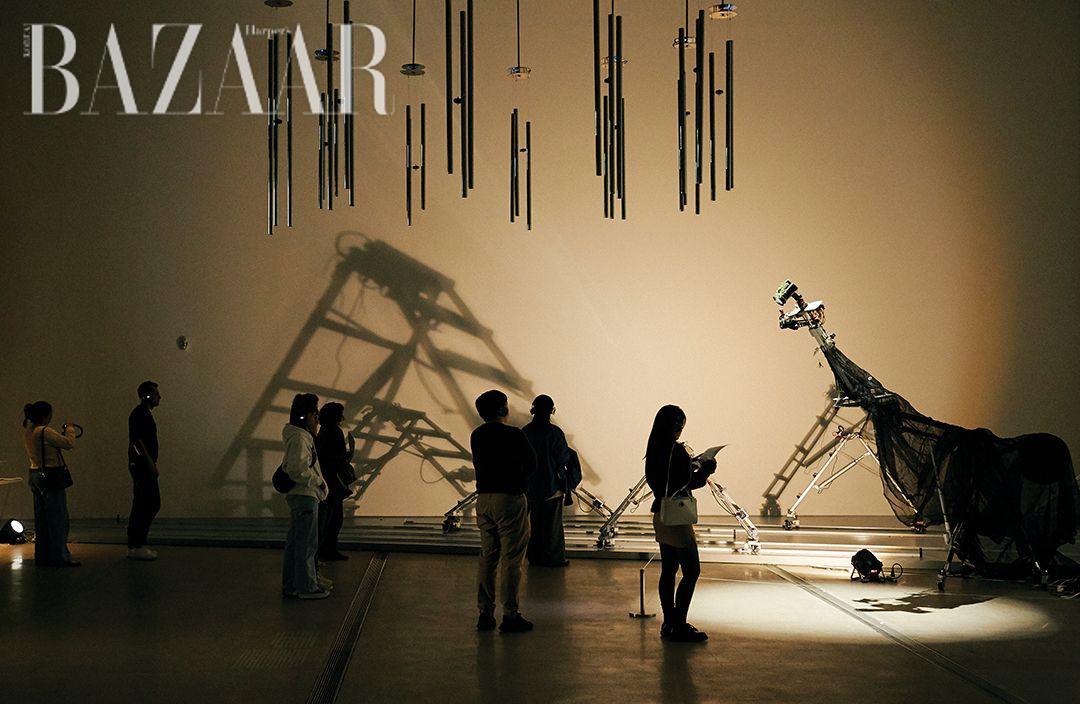 국립현대미술관 «올해의 작가상 2023»을 수상한 작품들, 쏟아지는 소리와 로봇의 분주한 움직임이 펼쳐지는 무대는 지금까지의 음악 활동에 따른 여러 경험치가 녹아 있는 것처럼 보였다. 실험적인 전자악기를 만들다 좀 더 큰 의미에서의 무대 장치로 확장된 것 같다. 나는 로봇들을 제어하는 것이 아니라 연주한다. 단원이자 밴드 멤버인 존재를 만들어 함께하고 있는 것이다. 사실 대중음악을 한 기간보다 그 외의 활동을 한 시간이 몇 배 더 길다. 미디어 아티스트로서의 작업 타이틀, 예를 들면 <싸구려 인조 인간의 노랫말> <오묘한 진리의 숲> <또 다른 달 또 다른 생>은 대중음악을 하던 시절의 노래 가사에서 따온 제목들이다. 그때의 마음을 다양한 표현 방식을 사용해서 만드는 것이지 뿌리가 그렇게 다르지 않다. 로봇들이 보여주는 춤과 노래를 부르는 것 같은 동작들 역시 내가 느꼈던 여러 감정과 깨달음에 기반하고 있다고 봐도 될 것 같다.