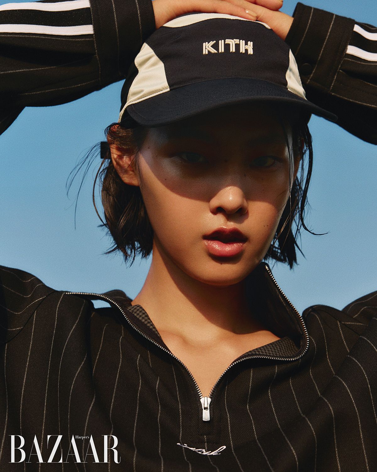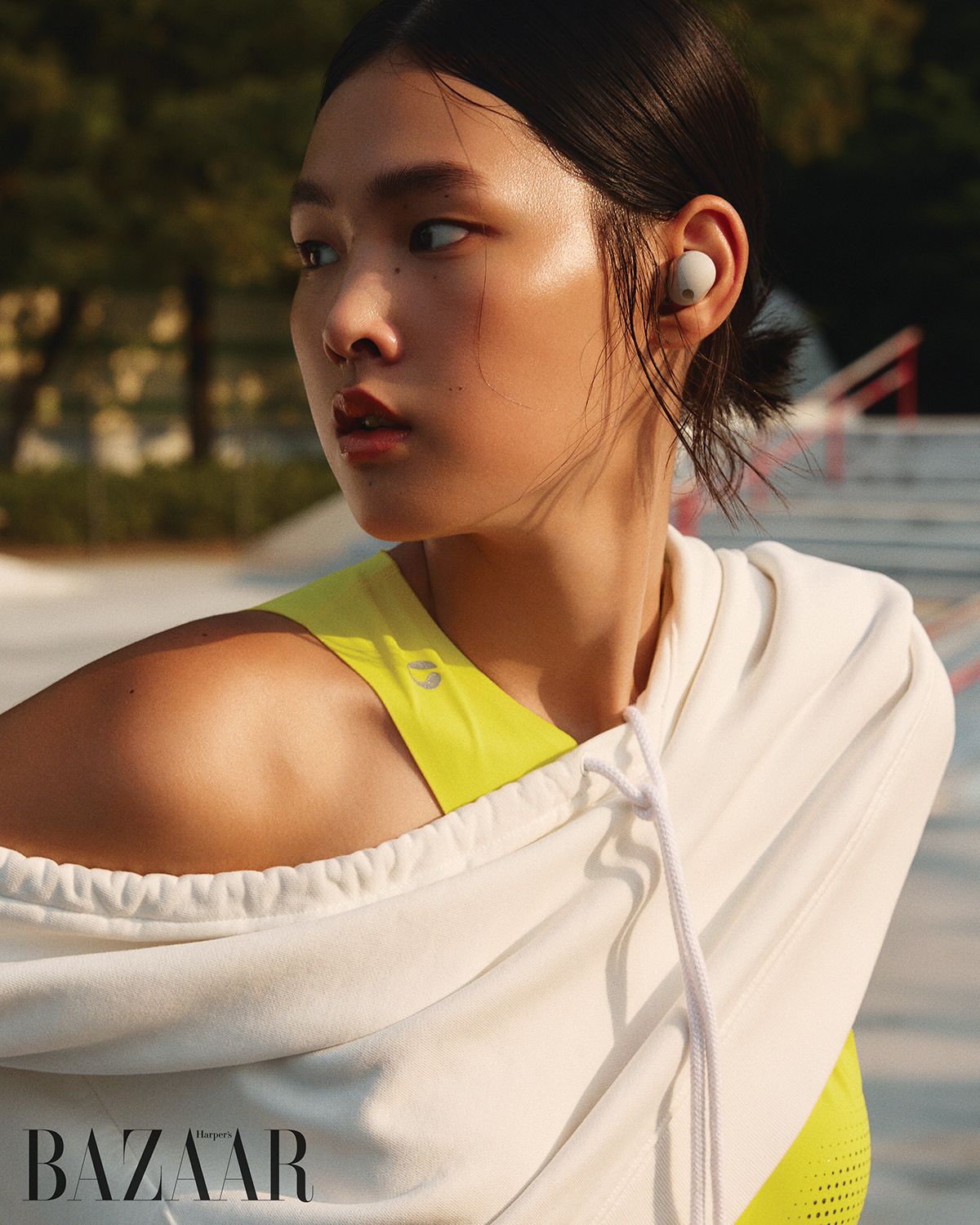 아우터는 Alexander Wang. 톱은 Sllow Garments. 레깅스는 Lululemon. 양말은 Nike. 슈즈는 New Balance.