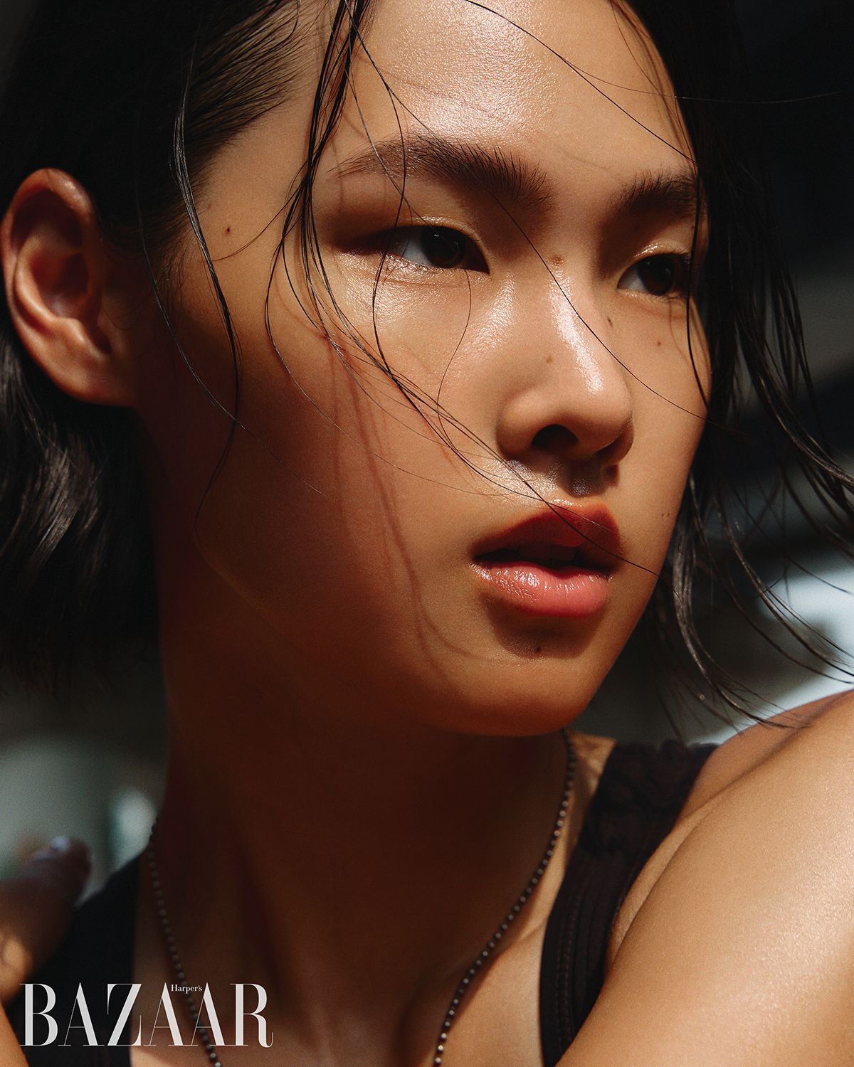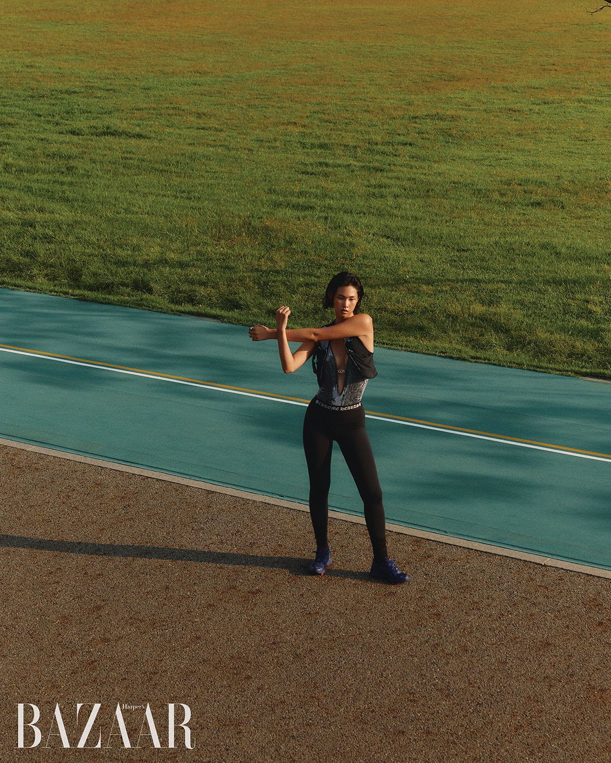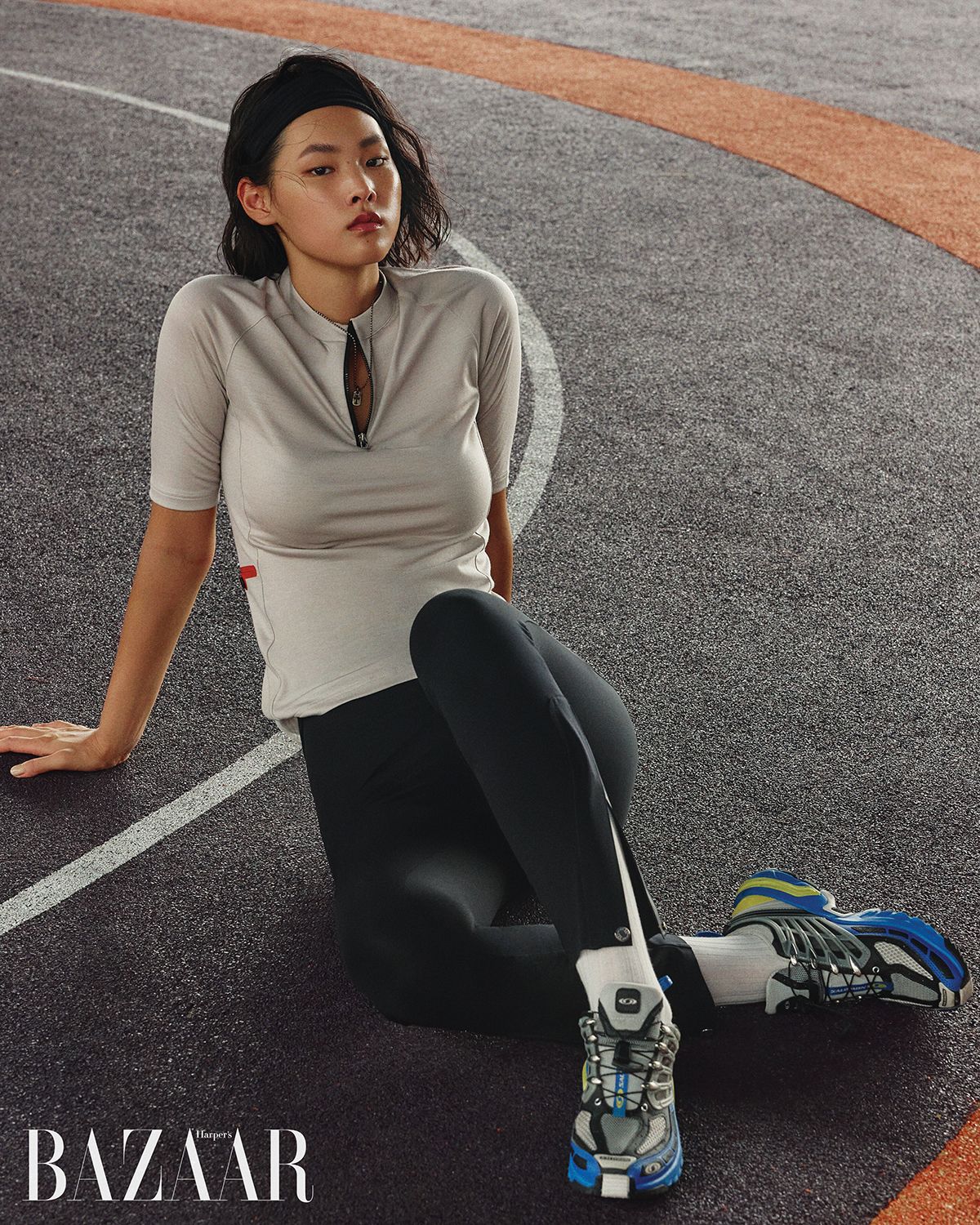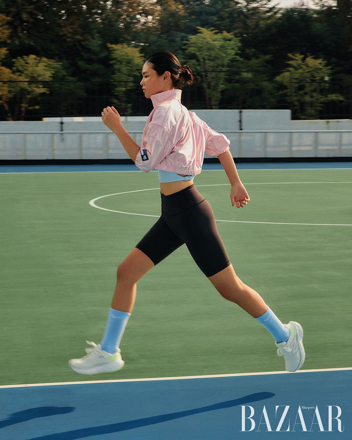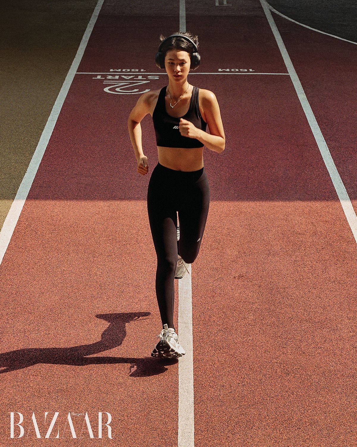 트레일 러닝 베스트는 Salomon. 보디수트는 Diesel. 레깅스는 Chrome Hearts. 반지는 Diesel. 양말은 Mongdol. 슈즈는 Asics.