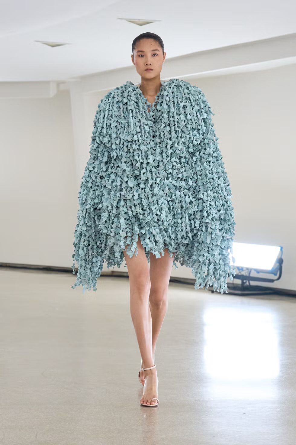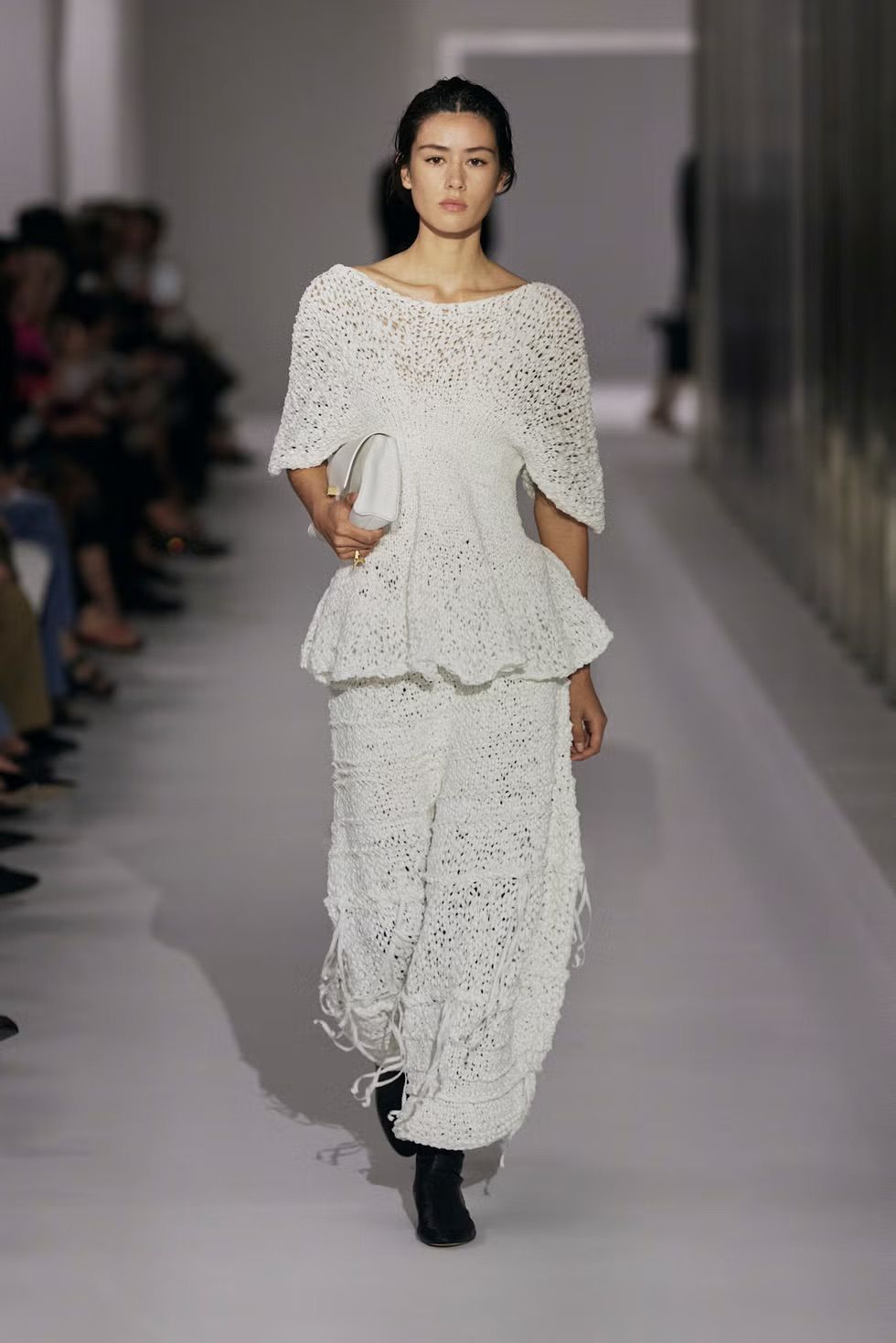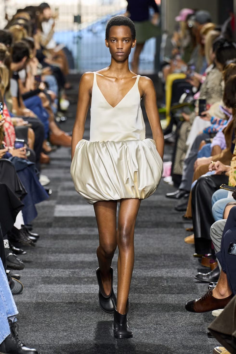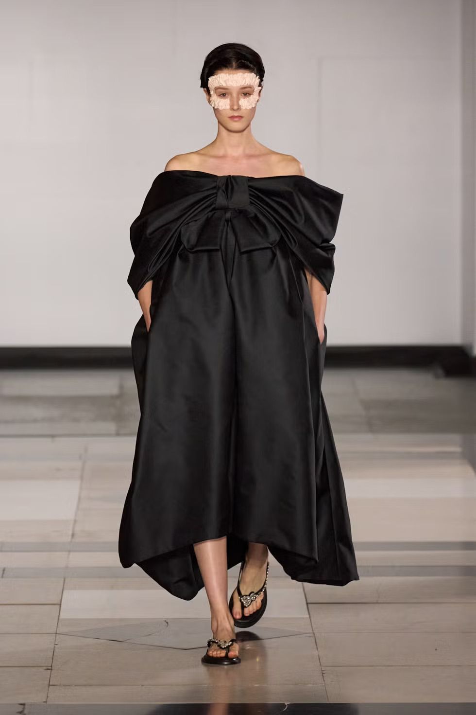 이번 시즌 JW 앤더슨은 디자인을 간소화했다. “새틴, 캐시미어 니트, 송아지 가죽, 그리고 유일한 장식으로는 스팽글만 사용했다.”고 쇼 노트에 설명을 남겼다. 이렇게 엄격한 제안을 두는 것을 해방감으로 표현하며, 제한된 소재로 의복 본질에 대한 디자인 탐구를 진행했다고 밝혔다. 이러한 제한적인 접근 방식을 통해 ‘현대적인 아름다움’을 탐구했고, 이는 공중에 떠있는 듯한, 과장된 실루엣의 미니 드레스, 지퍼가 열린 앵클 부츠, 드라마틱하게 엮인 니트 웨어가 그 결과물이다.