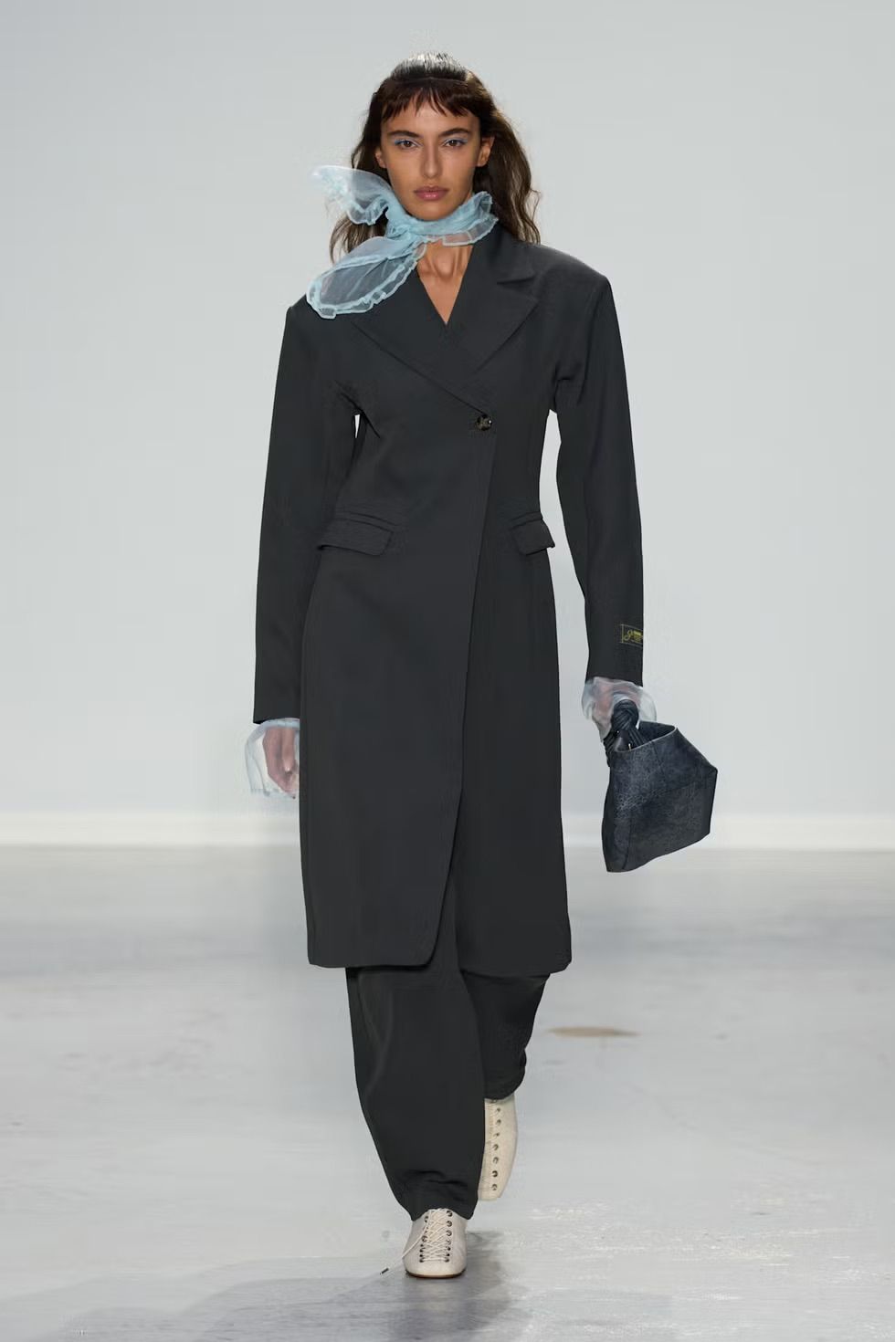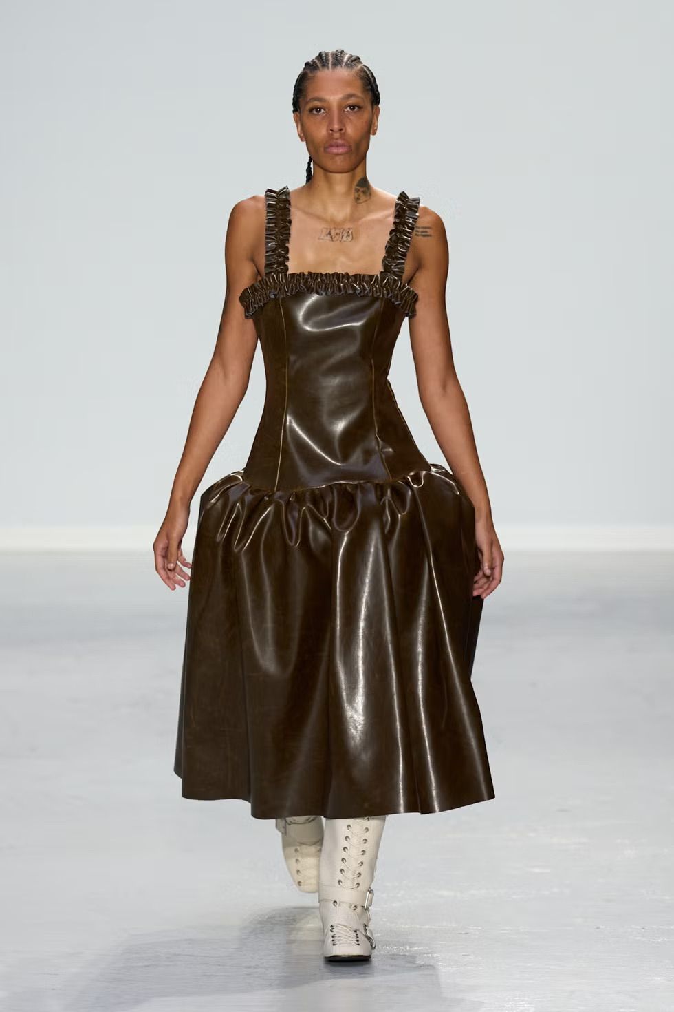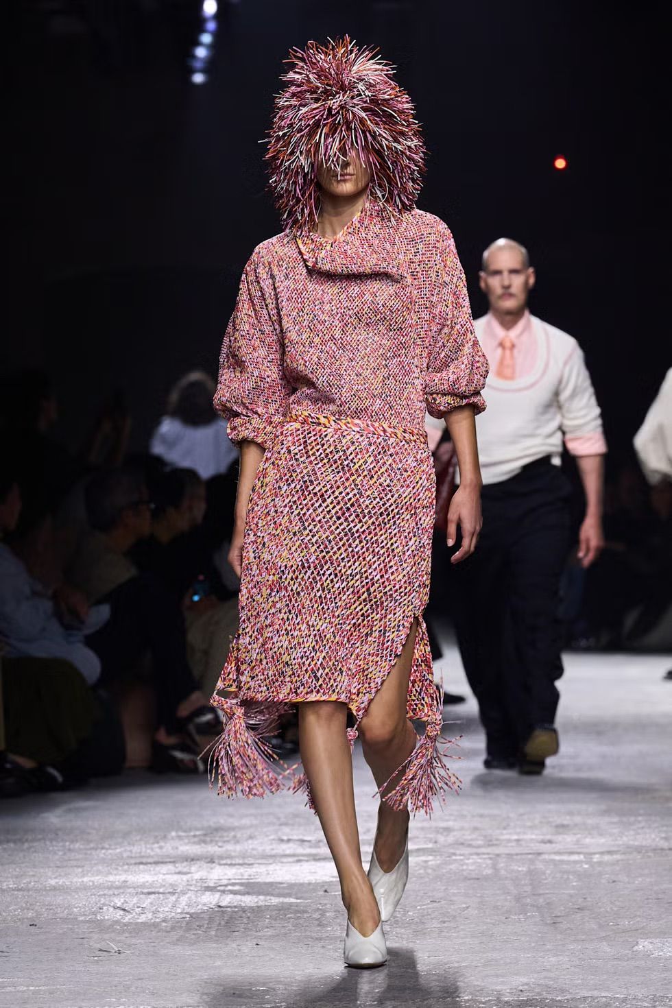 이번 시즌 JW 앤더슨은 디자인을 간소화했다. “새틴, 캐시미어 니트, 송아지 가죽, 그리고 유일한 장식으로는 스팽글만 사용했다.”고 쇼 노트에 설명을 남겼다. 이렇게 엄격한 제안을 두는 것을 해방감으로 표현하며, 제한된 소재로 의복 본질에 대한 디자인 탐구를 진행했다고 밝혔다. 이러한 제한적인 접근 방식을 통해 ‘현대적인 아름다움’을 탐구했고, 이는 공중에 떠있는 듯한, 과장된 실루엣의 미니 드레스, 지퍼가 열린 앵클 부츠, 드라마틱하게 엮인 니트 웨어가 그 결과물이다.