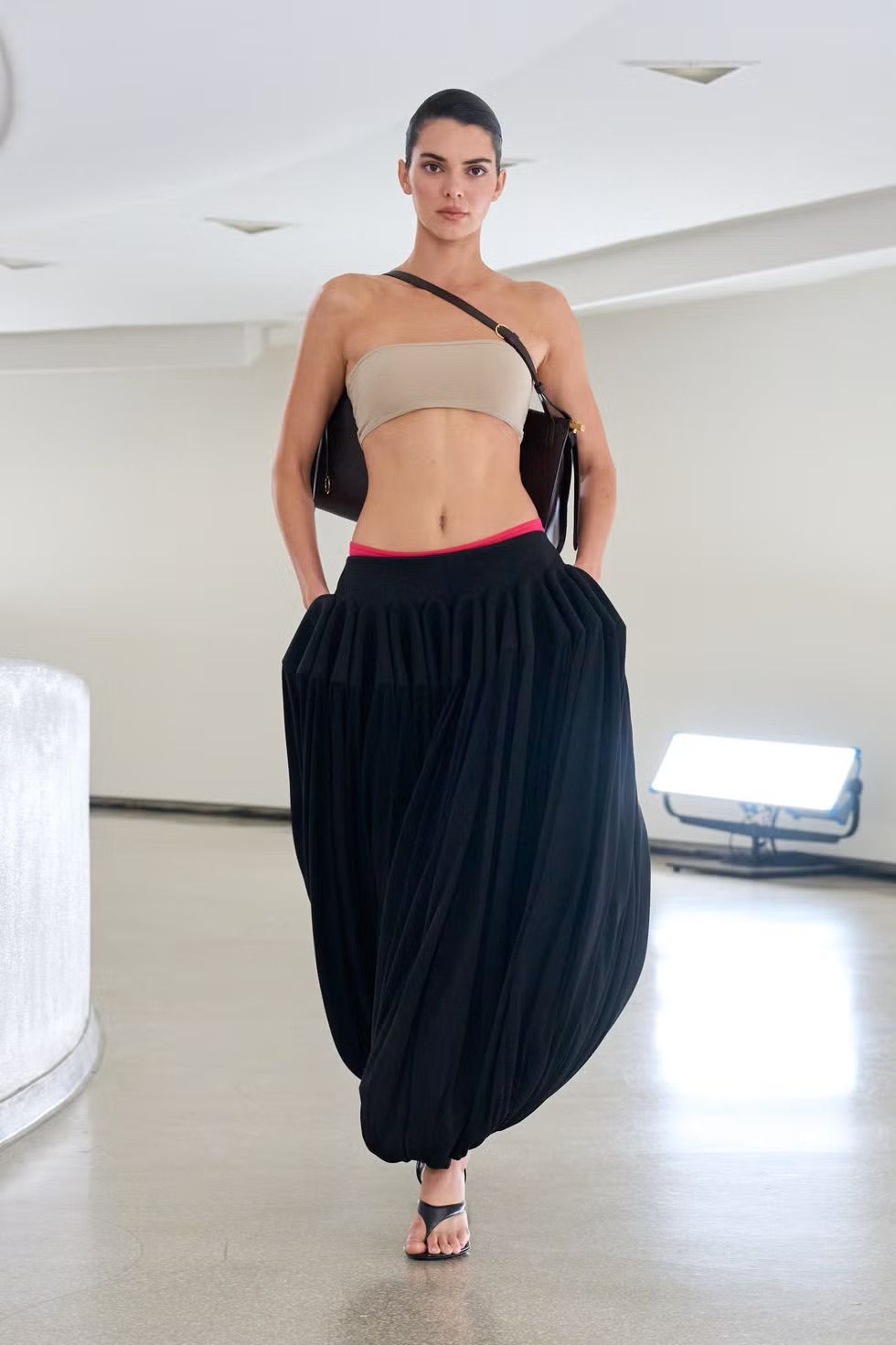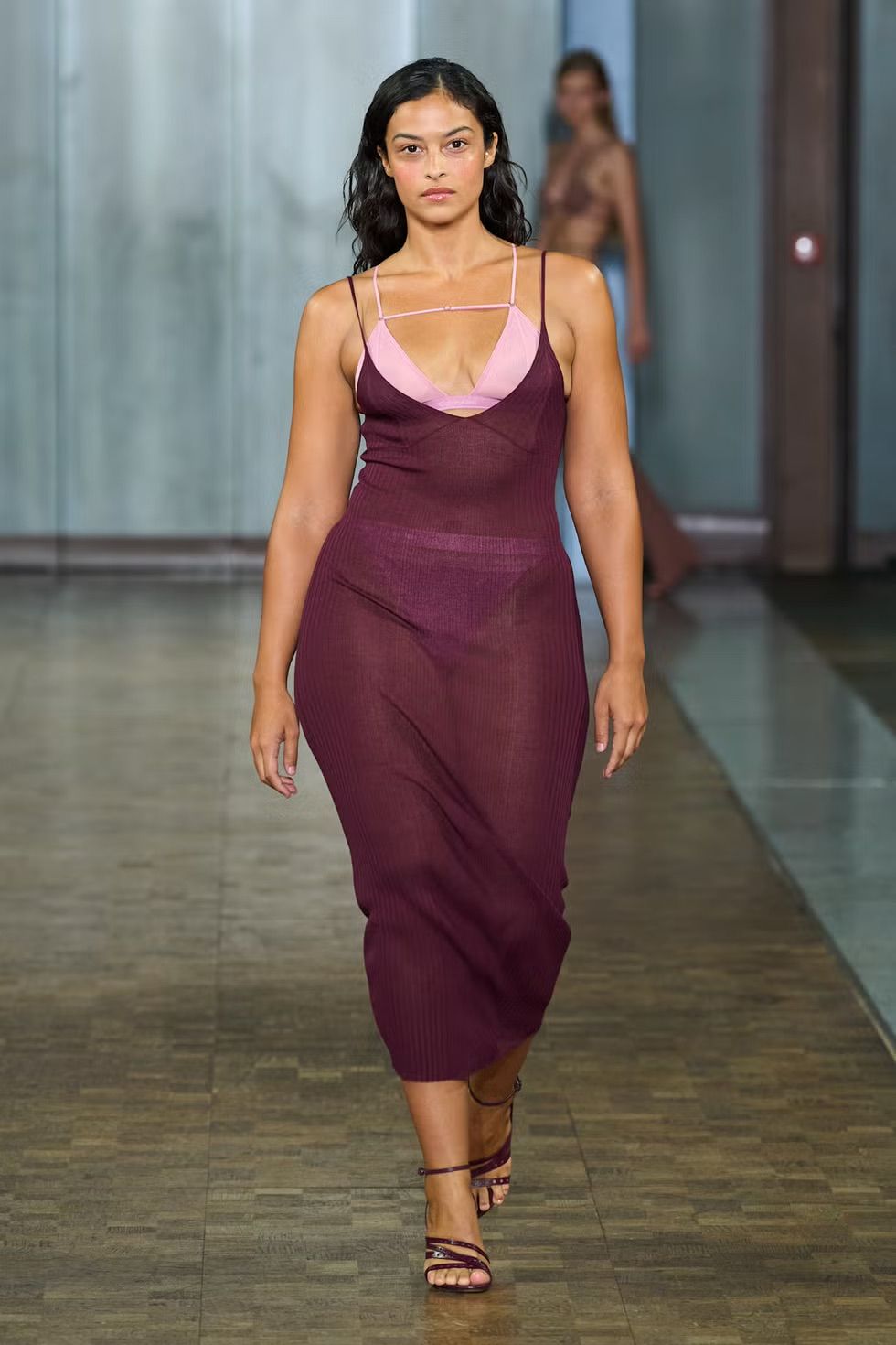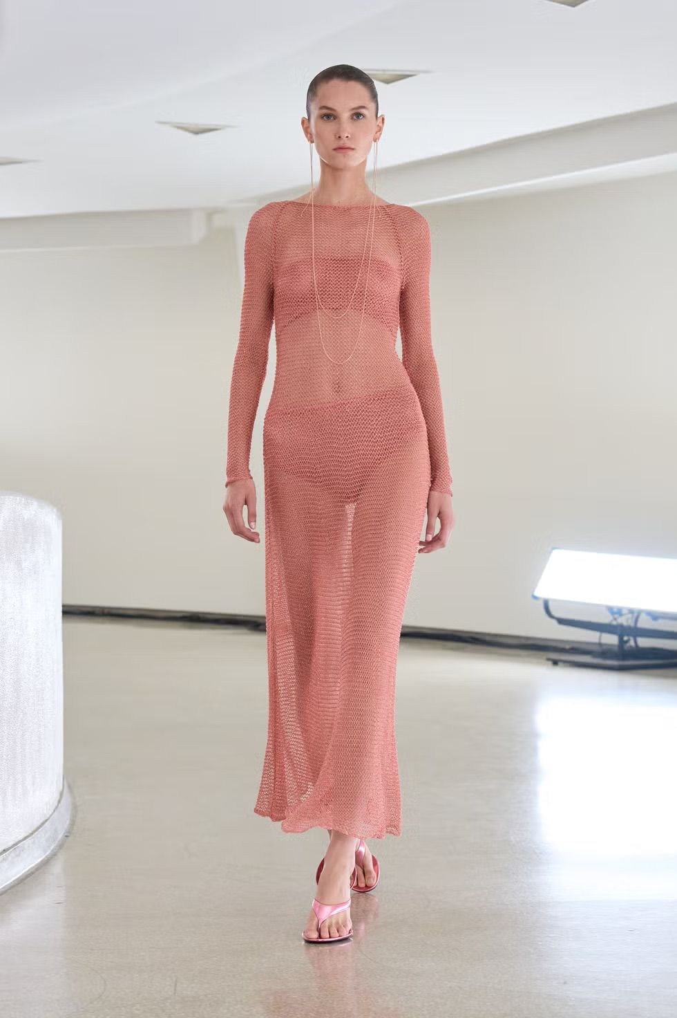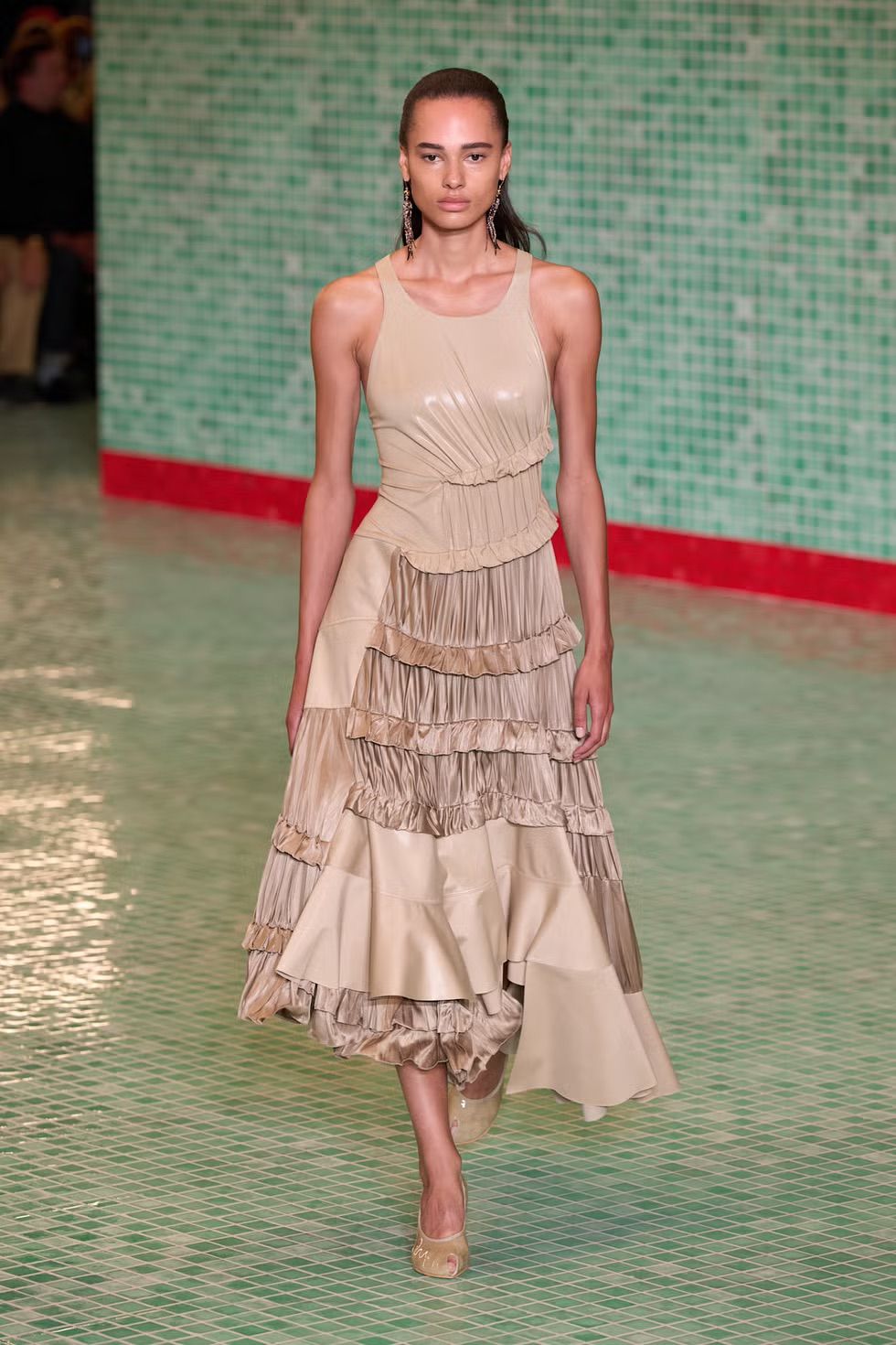 이번 시즌 JW 앤더슨은 디자인을 간소화했다. “새틴, 캐시미어 니트, 송아지 가죽, 그리고 유일한 장식으로는 스팽글만 사용했다.”고 쇼 노트에 설명을 남겼다. 이렇게 엄격한 제안을 두는 것을 해방감으로 표현하며, 제한된 소재로 의복 본질에 대한 디자인 탐구를 진행했다고 밝혔다. 이러한 제한적인 접근 방식을 통해 ‘현대적인 아름다움’을 탐구했고, 이는 공중에 떠있는 듯한, 과장된 실루엣의 미니 드레스, 지퍼가 열린 앵클 부츠, 드라마틱하게 엮인 니트 웨어가 그 결과물이다.