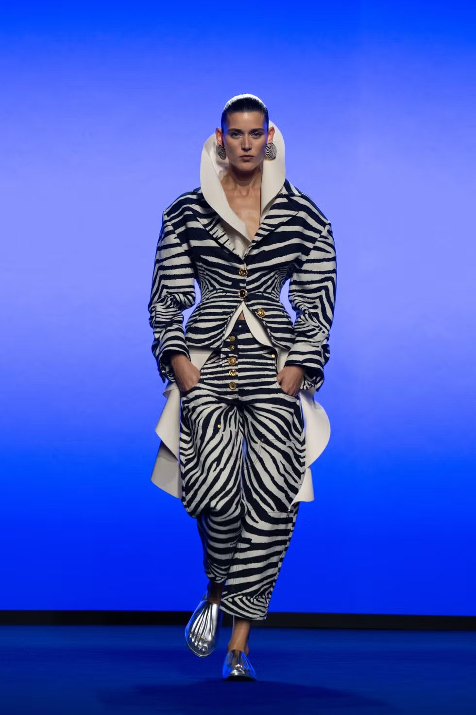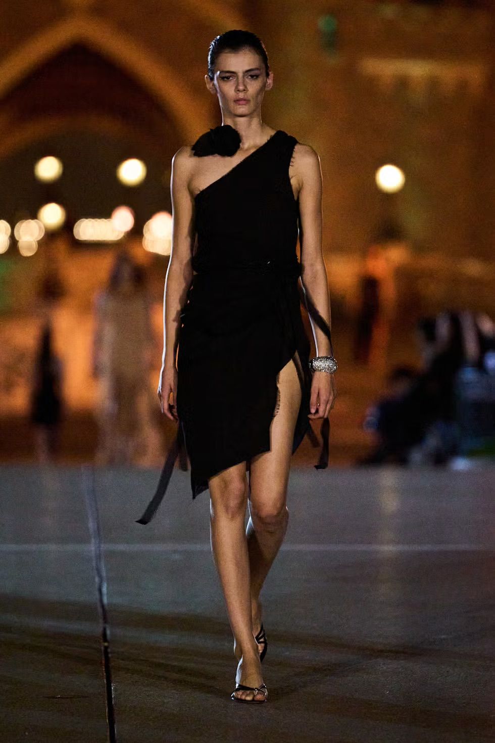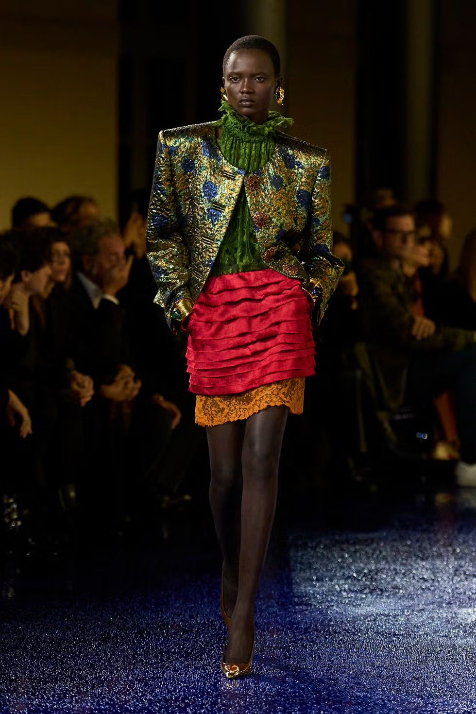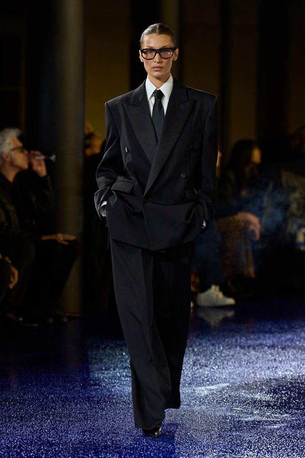 이번 시즌 안토니 바카렐로는 브랜드의 창립자인 입 생 로랑에 경의를 표하는 컬렉션을 선보이며, 그의 상징적인 룩에 초점을 맞췄다. 오버사이즈 더블 브레스트 수트 재킷, 테일러링과 함께한 가죽 봄버 자켓, 그의 오버사이즈 안경과 넥타이 같은 요소가 돋보인다.