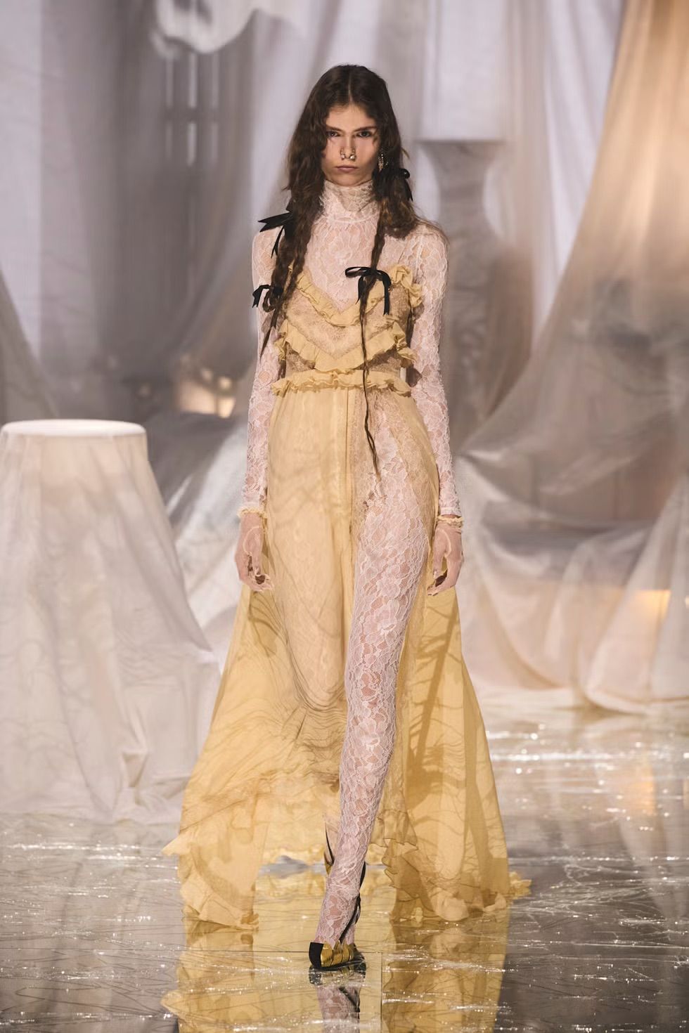 이번 시즌은 알레산드로 미켈레가 발렌티노의 첫 런웨이를 선보인 중요한 순간이다. 이번 컬렉션은 발렌티노의 역사, 특히 1970년대에 영감받은 요소들이 미켈레의 상징적인 맥시멀리즘이 더해져 현 시대에 맞게 재해석되었다. 오버사이즈 모자, 피어싱, 도트 패턴, 플라워 패턴, 리본, 러플 등 다채로운 장식들이 돋보였다. 미켈레는 이번 컬렉션이 옷을 입는 즐거움과 아름다움 속에서 의미를 찾는 것에 중점을 두고 있다고 밝혔다.