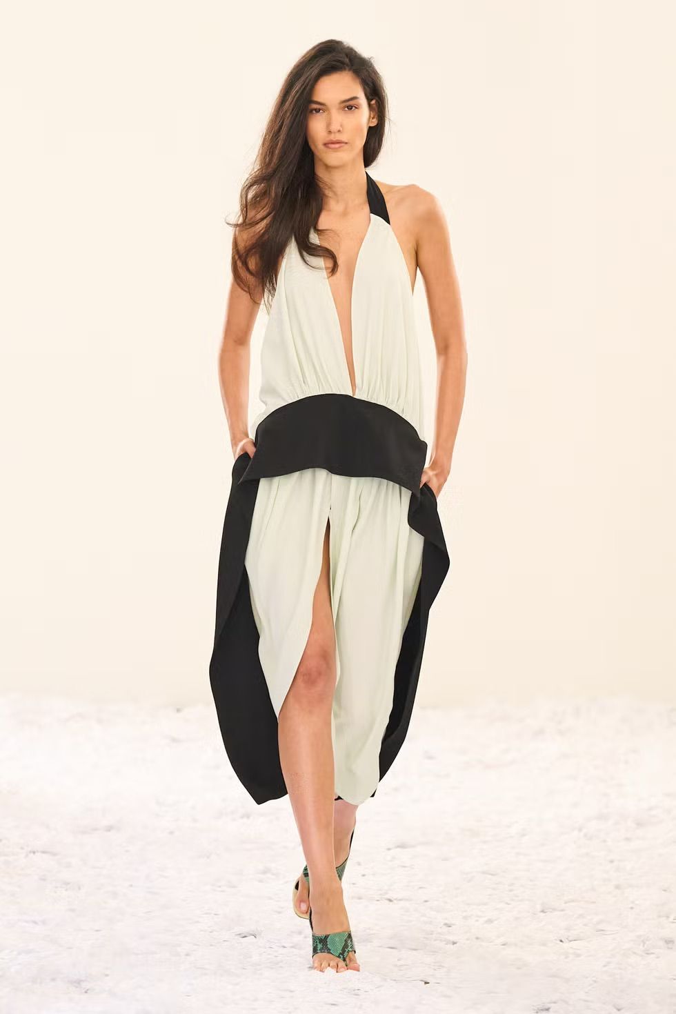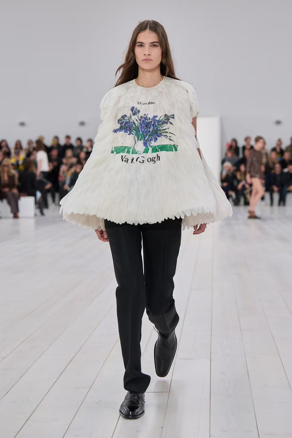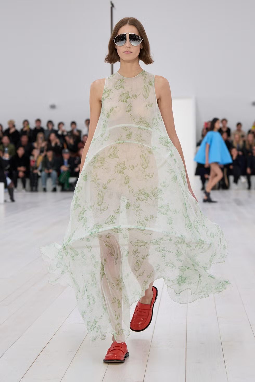 “모든 소음을 없애면 어떤 일이 일어날까? 텅 빈 하얀 방을 집중하도록 할 수 있는 방법이 있을까?” 조나단 앤더슨은 이 질문에 극단적인 단순화로 답한다. 모든 것을 벗겨내고 남는 것은 실루엣이다. 구브러지고, 튕기며, 곡선을 따라 흐르고, 길거나 대충 잘린 형태로 꿈속에서 왔다 갔다 하듯 몸을 따라 움직인다. 테일러링은 곡선의 흐름을 따라, 드레이핑은 원을 그리며 움직인다. 루프 드레스와 스커트의 웅장함이 팬츠와 일상적인 티셔츠의 조합과 조화로움을 이뤄낸다. 그러나 본래의 모습이란 없다. 재해석의 여지는 계속해서 존재한다고.