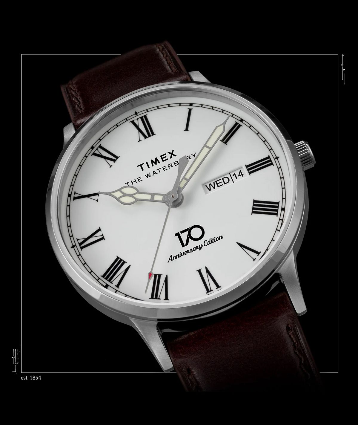 깔끔한 화이트 컬러의 다이얼, 빈티지한 매력을 배가하는 로마 숫자로 표기된 인덱스, 그리고 170주년 기념 문구가 중앙부에 새겨진 것이 특징. 11월 16일 타이맥스 글로벌 웹스토어를 통해 만나볼 수 있다.
