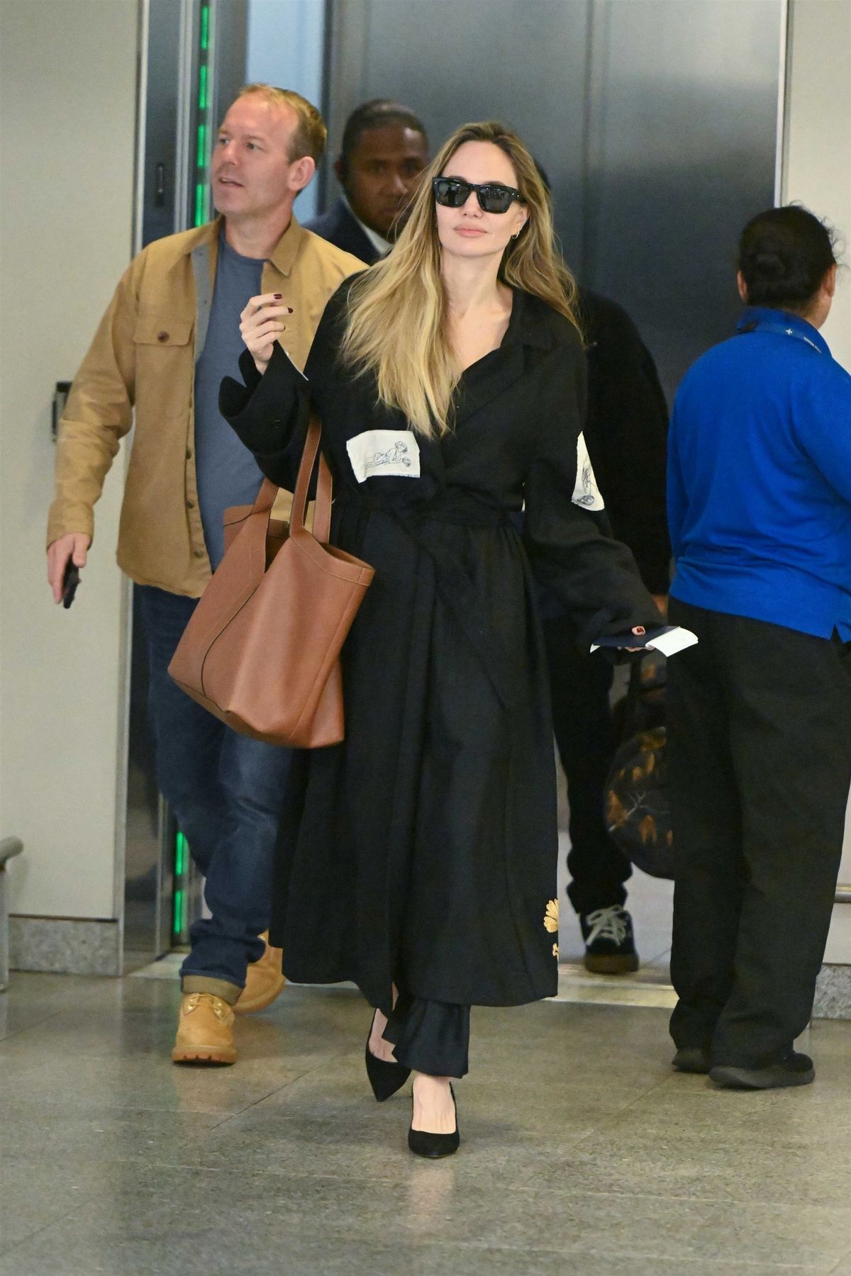 시크한 무드가 돋보이는 공항패션을 선보인 안젤리나 졸리. 블랙 코트와 팬츠로 완성한 올블랙 룩에 카멜 컬러의 빅 백으로 포인트를 줬다.