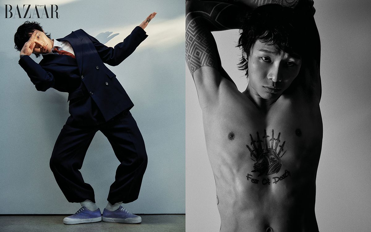 테일러드 재킷, 셔츠, 팬츠, 타이, 스니커즈는 모두 Loewe. 양말은 에디터 소장품.