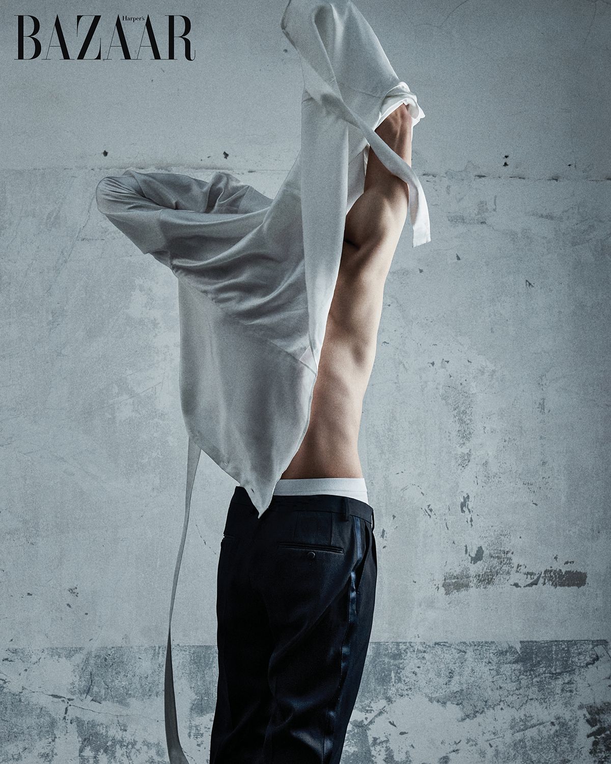 손에 들고 있는 셔츠와 타이, 팬츠, 더비 슈즈는 모두 Saint Laurent by Anthony Vaccarello.