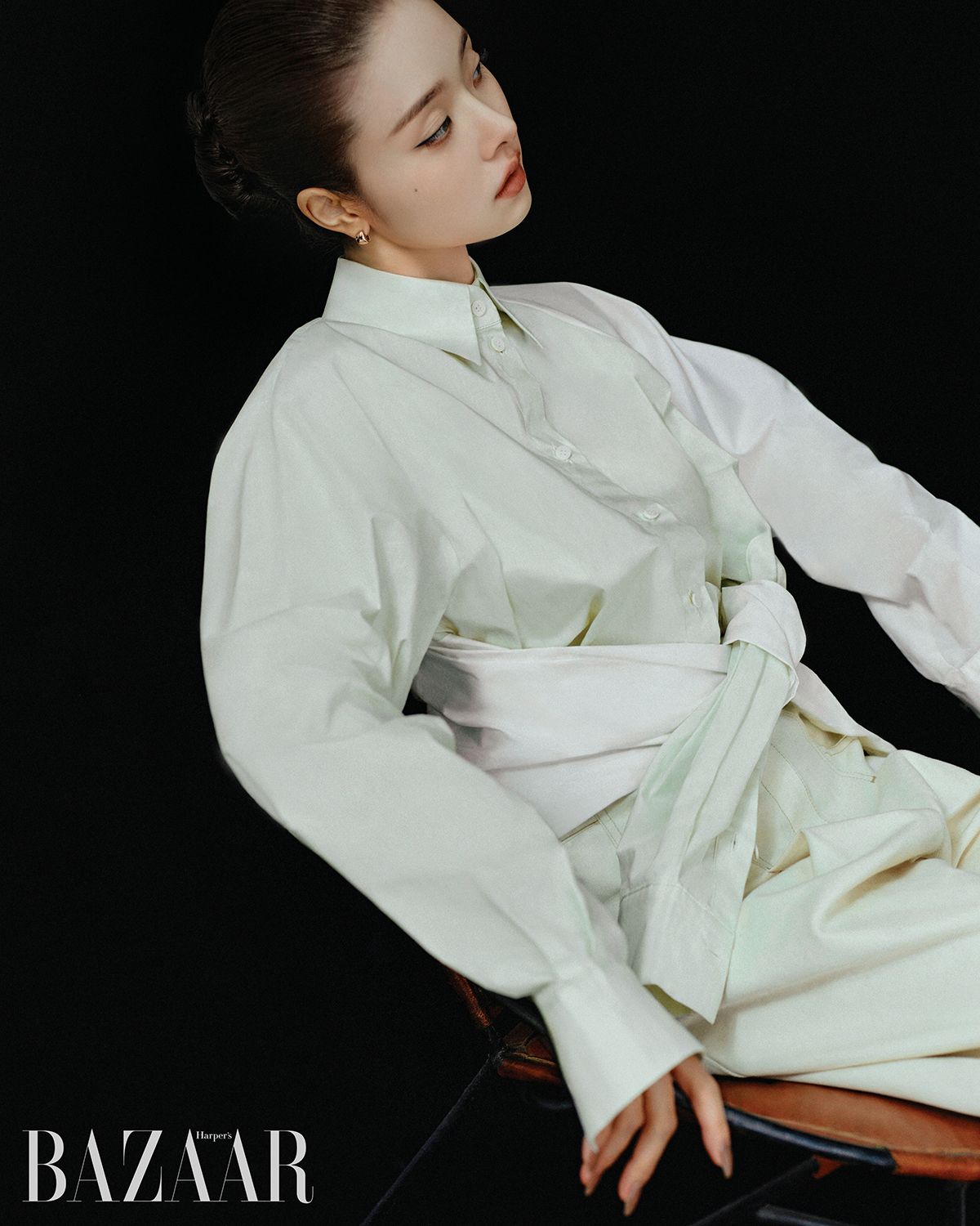 셔츠, 와이드 팬츠는 Nehera. 귀고리는 Didier Dubot.