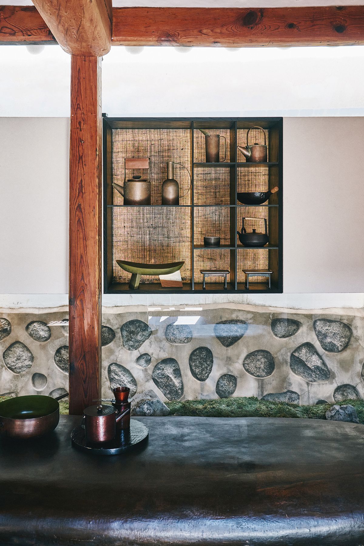 충분한 휴식 후 고고한 자태의 소나무 한 그루가 자리한 마당을 가로질러 위채로 향했다. 기단을 딛고 미닫이문을 열자 마주한 대청마루는 옆집 돌담이 드는 통창과 류연희 작가의 정갈한 공예 기물이 시선을 사로잡았다. 또한 대청의 주춧돌처럼 자리하는 허명욱 작가의 오브제는 조각과 가구의 경계를 오가며 강력한 힘을 자아냈다. 전통 한옥의 형태를 최대한 유지한 위채의 특성상 오브제는 바위처럼도 보였는데, 신선인 양 사랑하는 사람과 마주 앉아 차를 나누고 싶게 했다. 마루 위 반듯한 서까래는 하늘로 곧게 솟아오르며 산의 능선처럼 부드러운 곡선을 그려냈다. 공간의 모든 요소가 자연의 형태를 품고 있는 듯했다. 대청을 지나 이어지는 메인 침실에서는 촘촘한 띠살문으로 그윽한 달빛이 들었다. 방 안은 고요하기 그지없었다. 간만에 깊은 잠을 잔 날이었다.