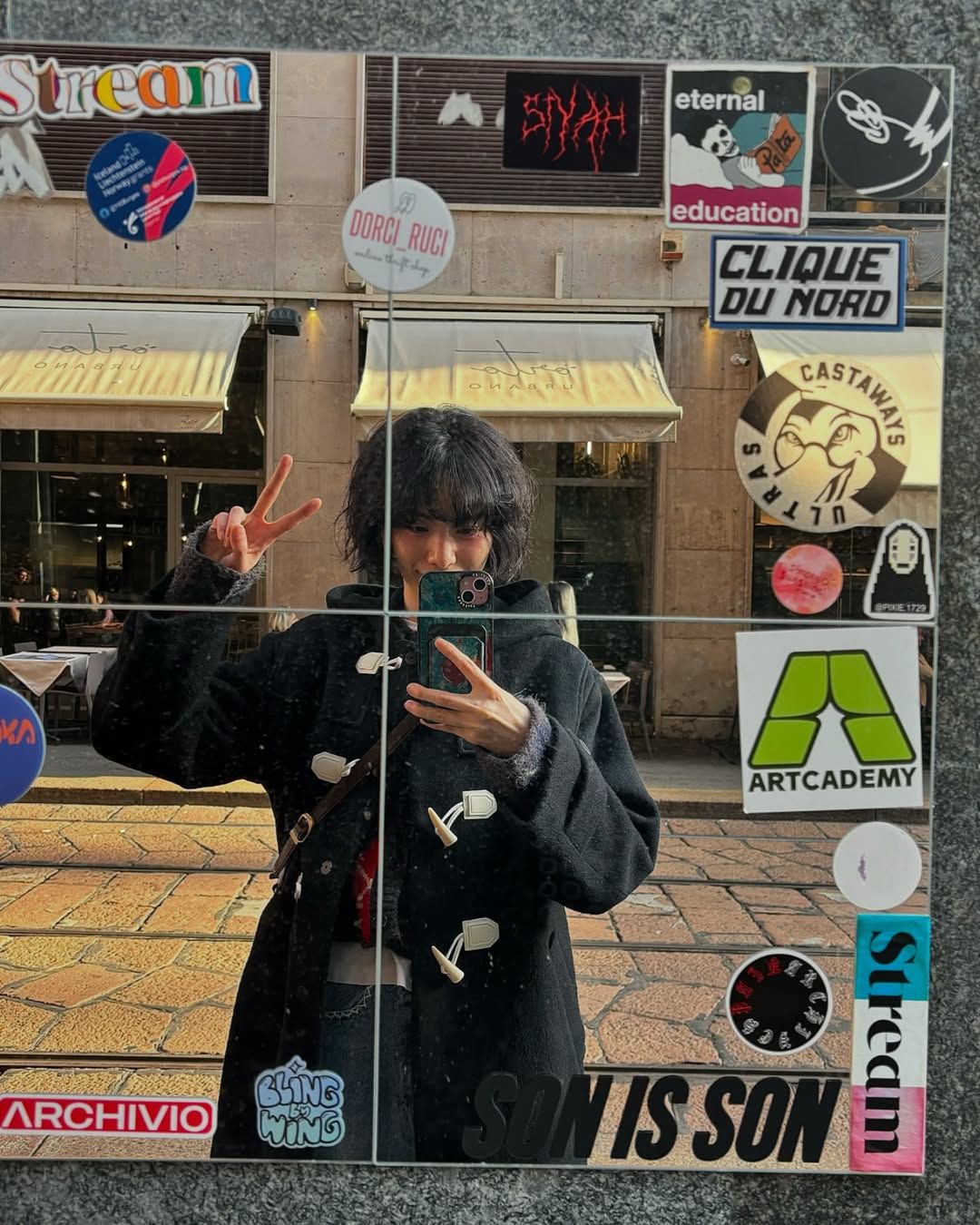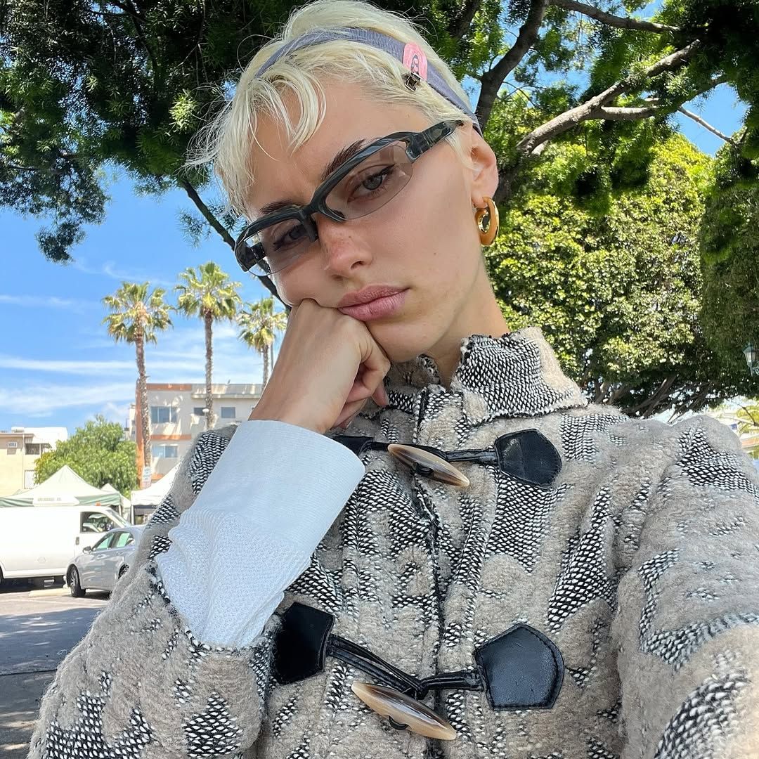 아이리스 로는 자카드 장식이 빈티지한 무드를 자아내는 하이네크 숏 코트를 고글 선글라스와 매치해 스포티하게 소화했다.