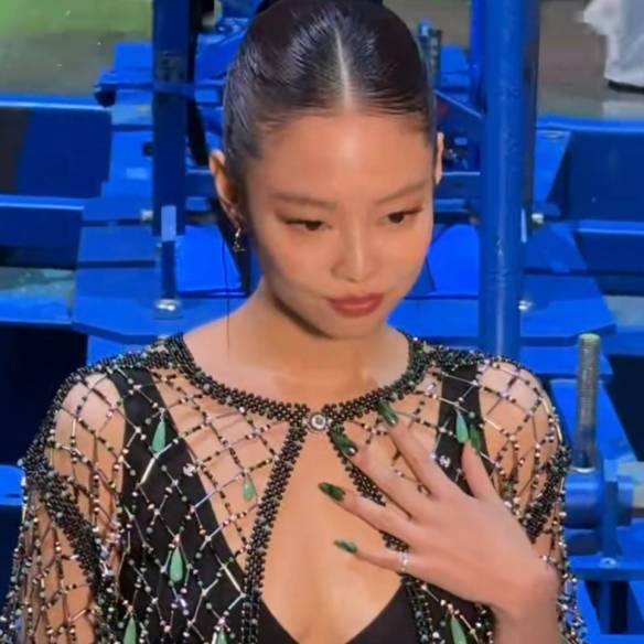 니트 톱은 3백만원대, 체크 패턴 팬츠는 1백만원대, 싱글 귀고리는 30만원대, 컵 홀더는 1백만원대, 목걸이는 80만원대, 오른팔에 착용한 커프는 80만원대, 약지의 반지는 50만원대, 체인 브레이슬릿은 50만원대, 왼손 검지의 반지는 50만원대, 중지의 반지는 40만원대, 스니커즈는 1백만원대 모두 Fendi.