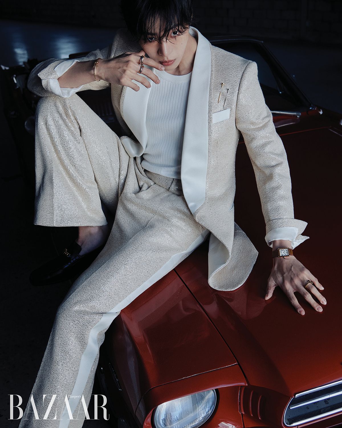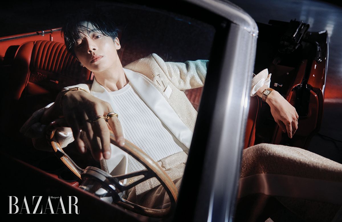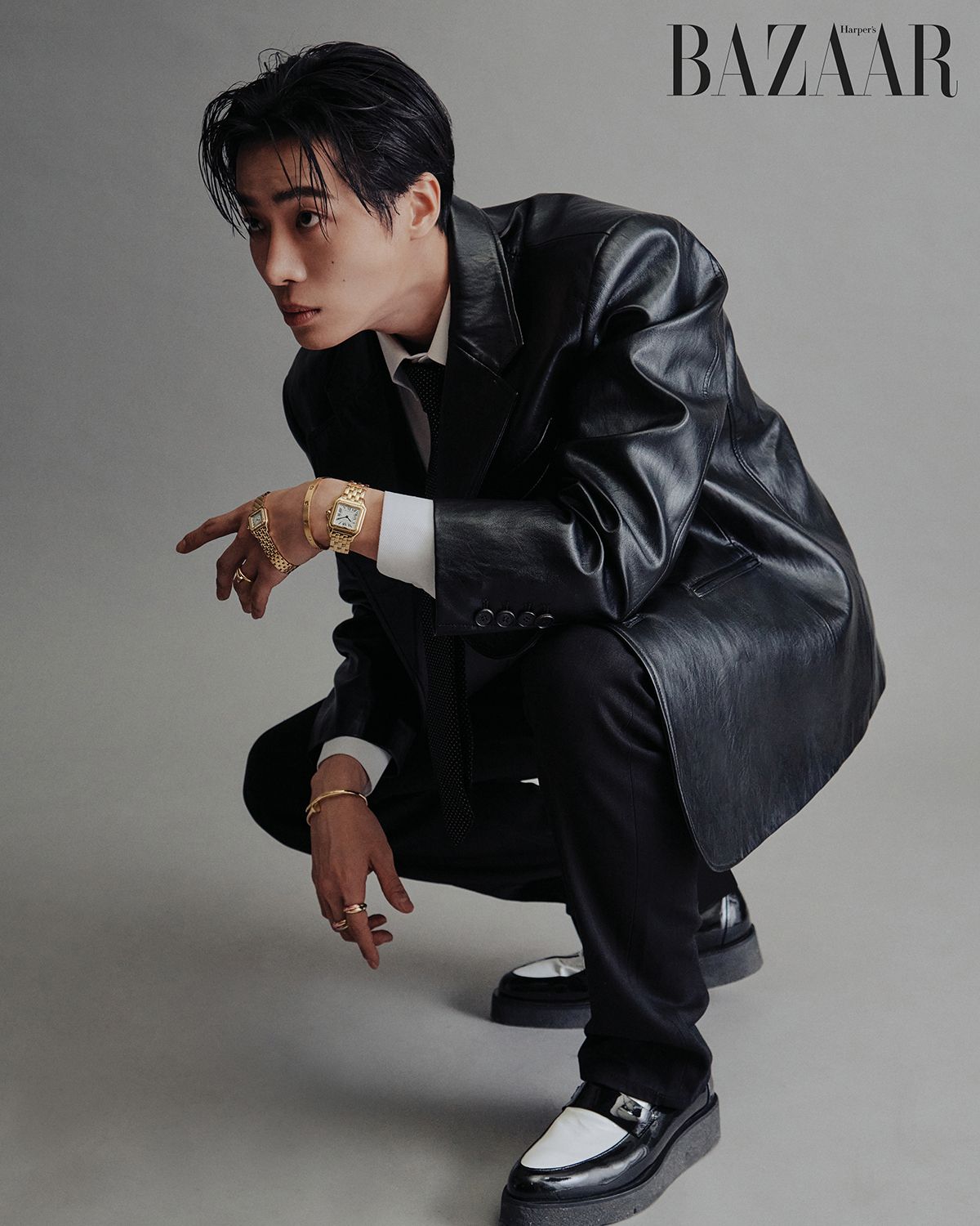 오른손 검지에 착용한 라지 사이즈의 ‘트리니티’ 링, 중지에 착용한 미디엄 사이즈의 ‘클래식 트리니티’ 링, ‘저스트 앵 끌루’ 브레이슬릿, 브로치로 활용한 옐로·화이트 골드 ‘저스트 앵 끌루’ 넥타이 핀, 왼팔의 ‘탱크 루이 까르띠에’ 워치, 약지에 착용한 미디엄 사이즈의 ‘저스트 앵 끌루’ 링은 모두 Cartier.