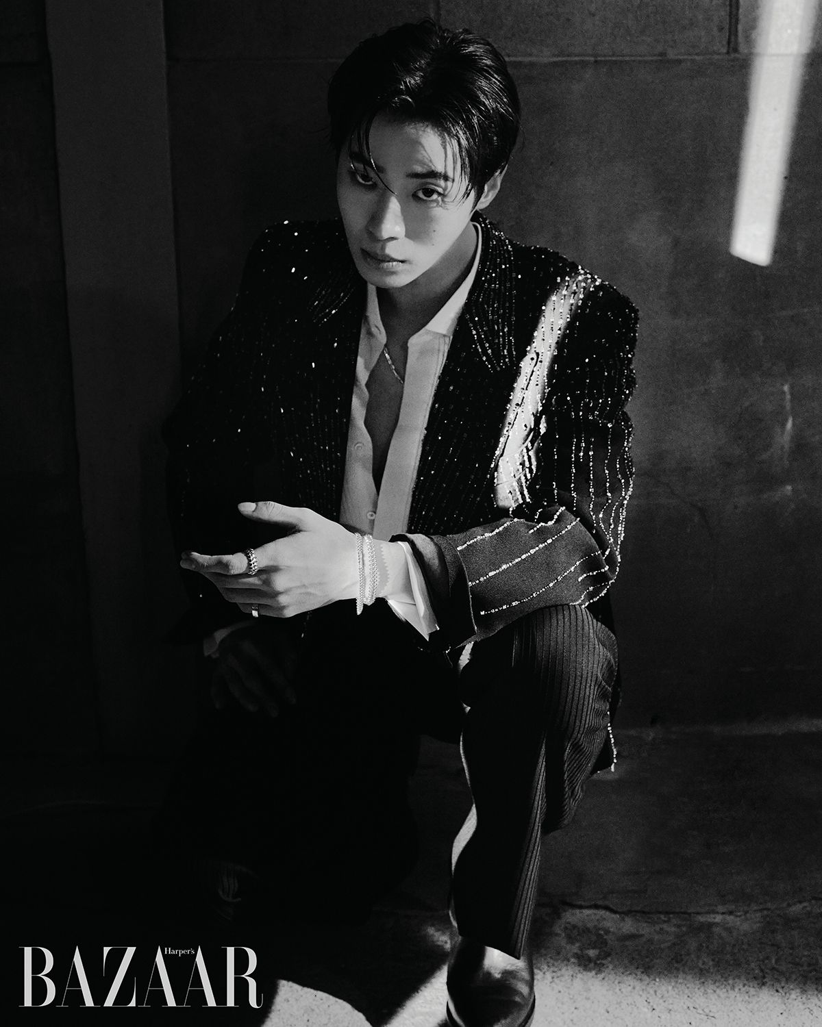 시퀸 소재 턱시도 수트, 로퍼는 Amiri. 슬리브리스 톱은 스타일리스트 소장품.