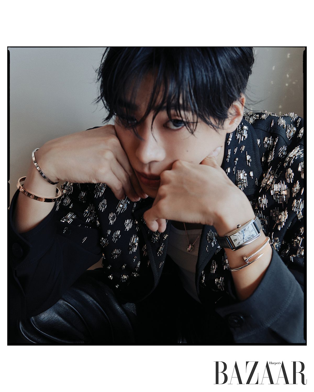 왼손 약지에 착용한 미디엄 사이즈의 ‘저스트 앵 끌루’ 링, 액세서리처럼 연출한 스몰 사이즈의 ‘팬더 드 까르띠에’ 워치, 시계 사이에 착용한 옐로 골드 ‘러브’ 브레이슬릿, 라지 사이즈의 ‘팬더 드 까르띠에’ 워치, 오른팔에 착용한 ‘저스트 앵 끌루’ 브레이슬릿, 검지에 착용한 미디엄 사이즈의 ‘클래식 트리니티’ 링, 중지에 착용한 라지 사이즈의 ‘트리니티’ 링은 모두 Cartier.