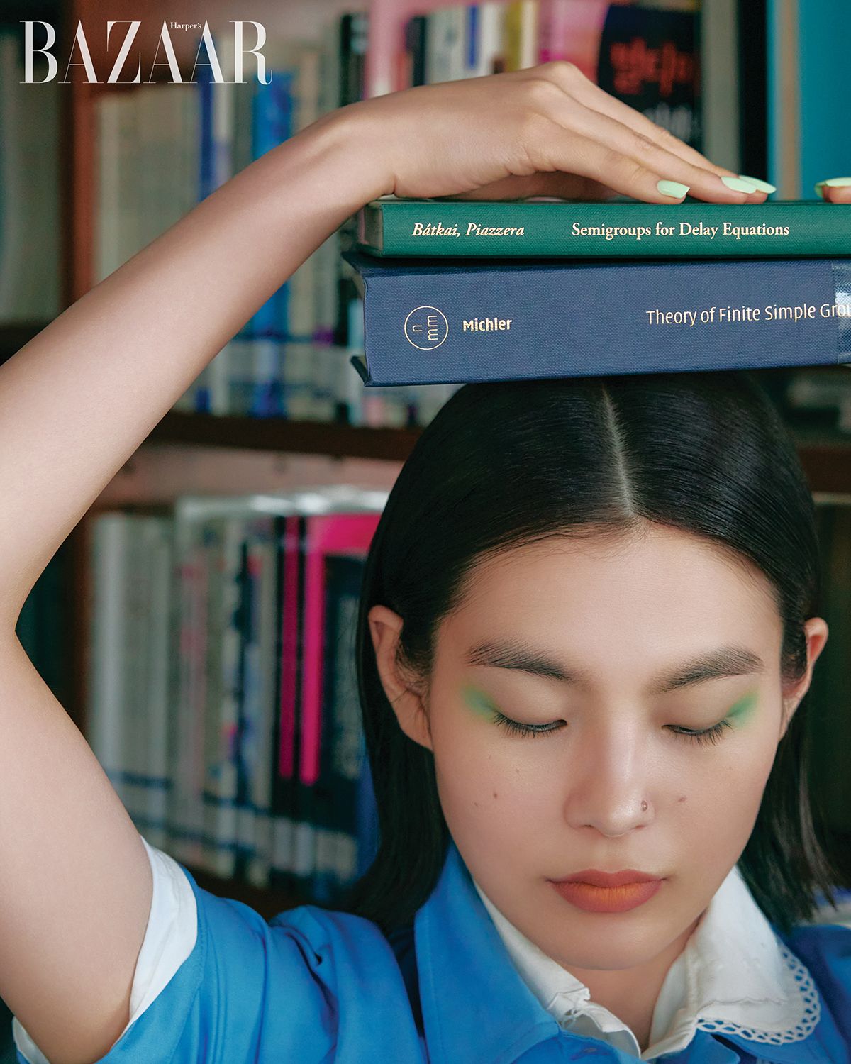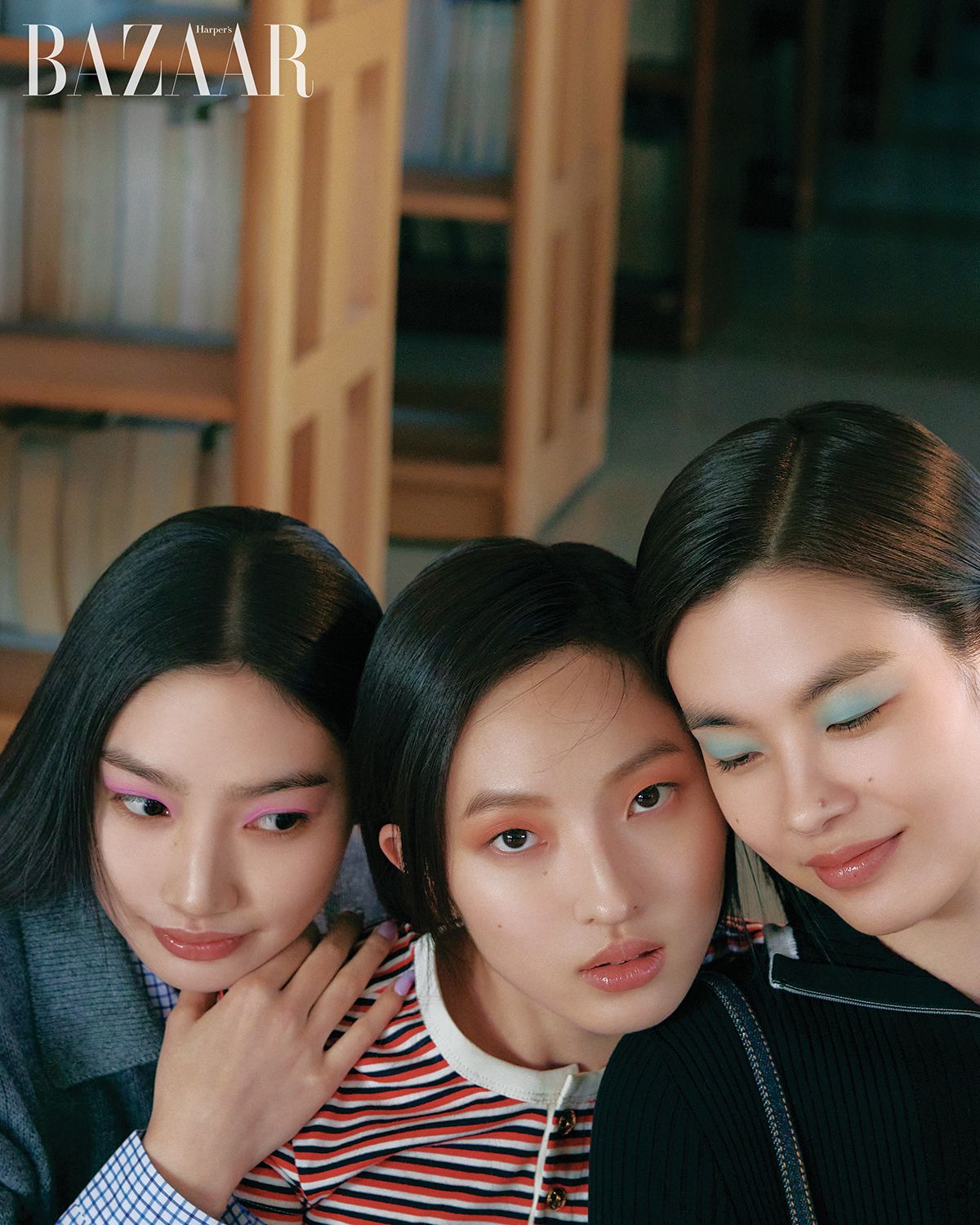 유엔씬이 입은 셔츠는 Claudie Pierlot. 폴로 스웨터는 Marni. 박하은이 입은 스트라이프 티셔츠는 Celine. 천예슬이 입은 집업 니트 톱, 데님 오버올은 Chanel.
