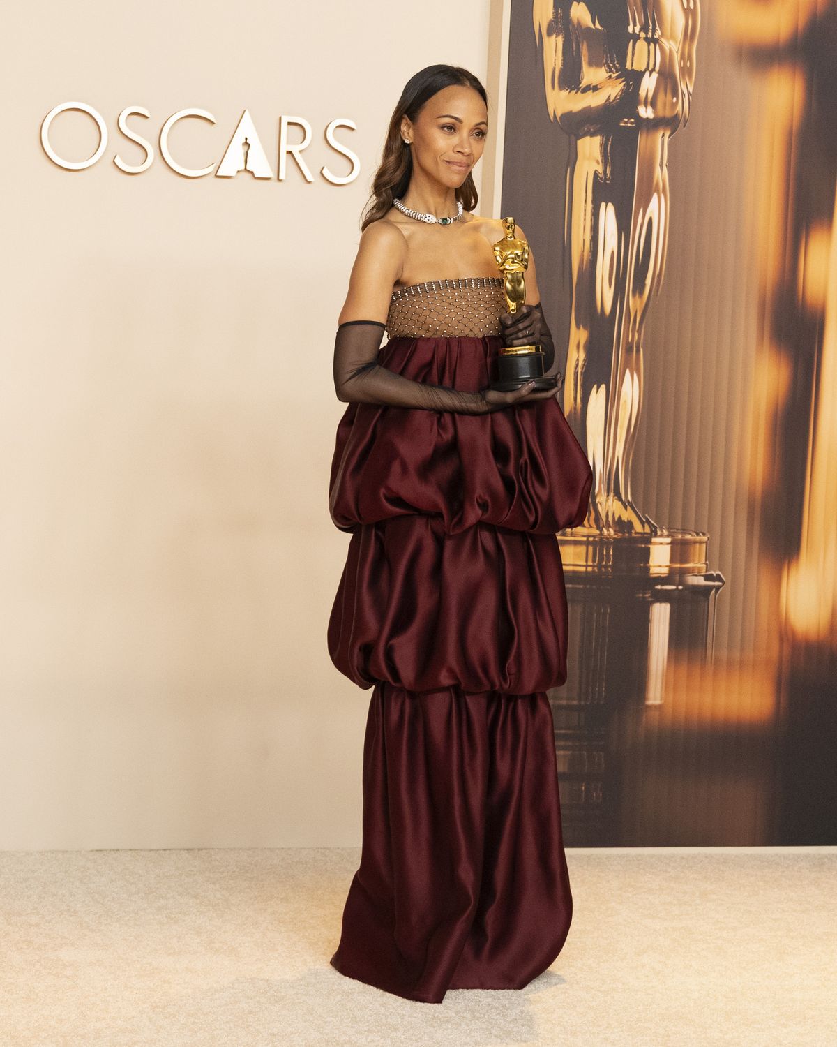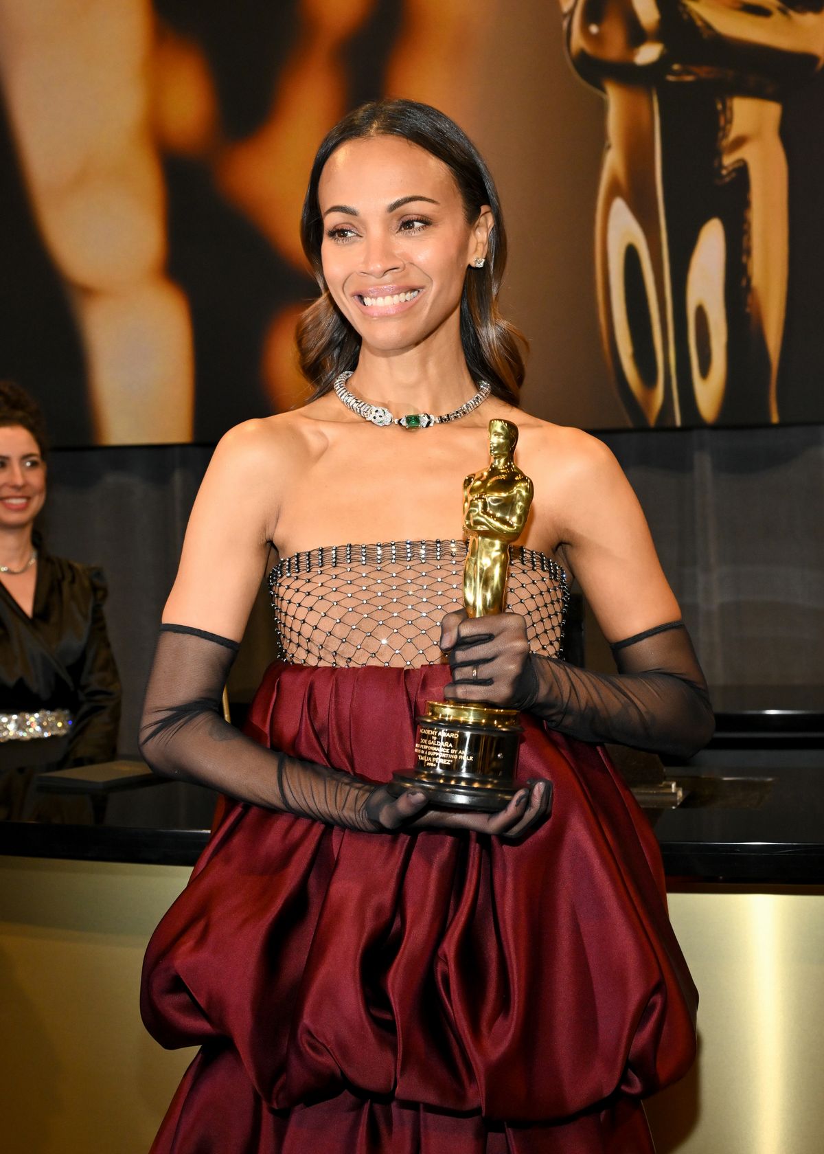 영화 <에밀리아 페레즈>로 여우 조연상을 수상한 조 샐다나는 안토니오 바카렐로가 디자인한 생로랑 드레스를 입고 등장했다. 스킨 컬러의 바스트와 삼 단의 층을 이룬 버블 헴 드레스와 볼드한 까르띠에 펜더 네크리스로 시선을 모았다. 제작에만 34개월이 걸린 이 대담한 주얼리는 그녀가 여우 조연상을 수상하면서 더욱 빛났다.