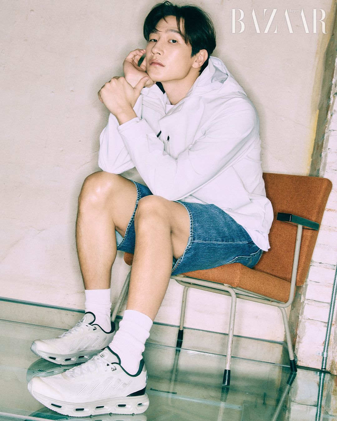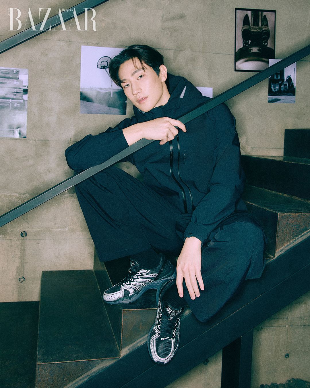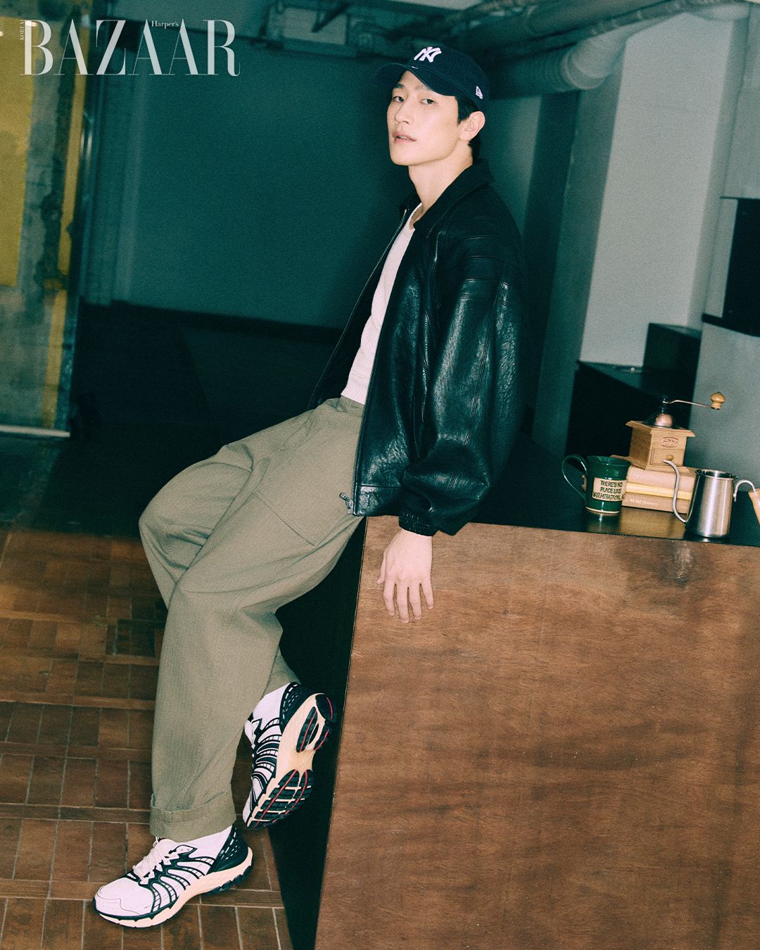신발을 활용한 스타일링 화보로 8개의 룩을 들여다볼 수 있는데, 클래식한 테니스 슈즈부터 스포티한 디자인의 스니커즈까지 다양한 케이스위스 아이템을 활용해 웨어러블하면서도 트렌디한 룩을 완성한 것. 특히 레더 재킷에 스니커즈를 매치하거나, 집업 형태의 윈드브레이커에 조거 팬츠를 조합한 올 블랙의 세미 고프코어 무드를 연출할 때는 실용적인 ‘꾸안꾸’ 스타일링 팁을 제안하기도 했다. 이처럼 그는 데일리 룩부터 액티브한 애슬레저 룩까지 다양한 스타일을 자유자재로 소화하며 특유의 부드러운 카리스마로 촬영 현장의 분위기를 주도했다.