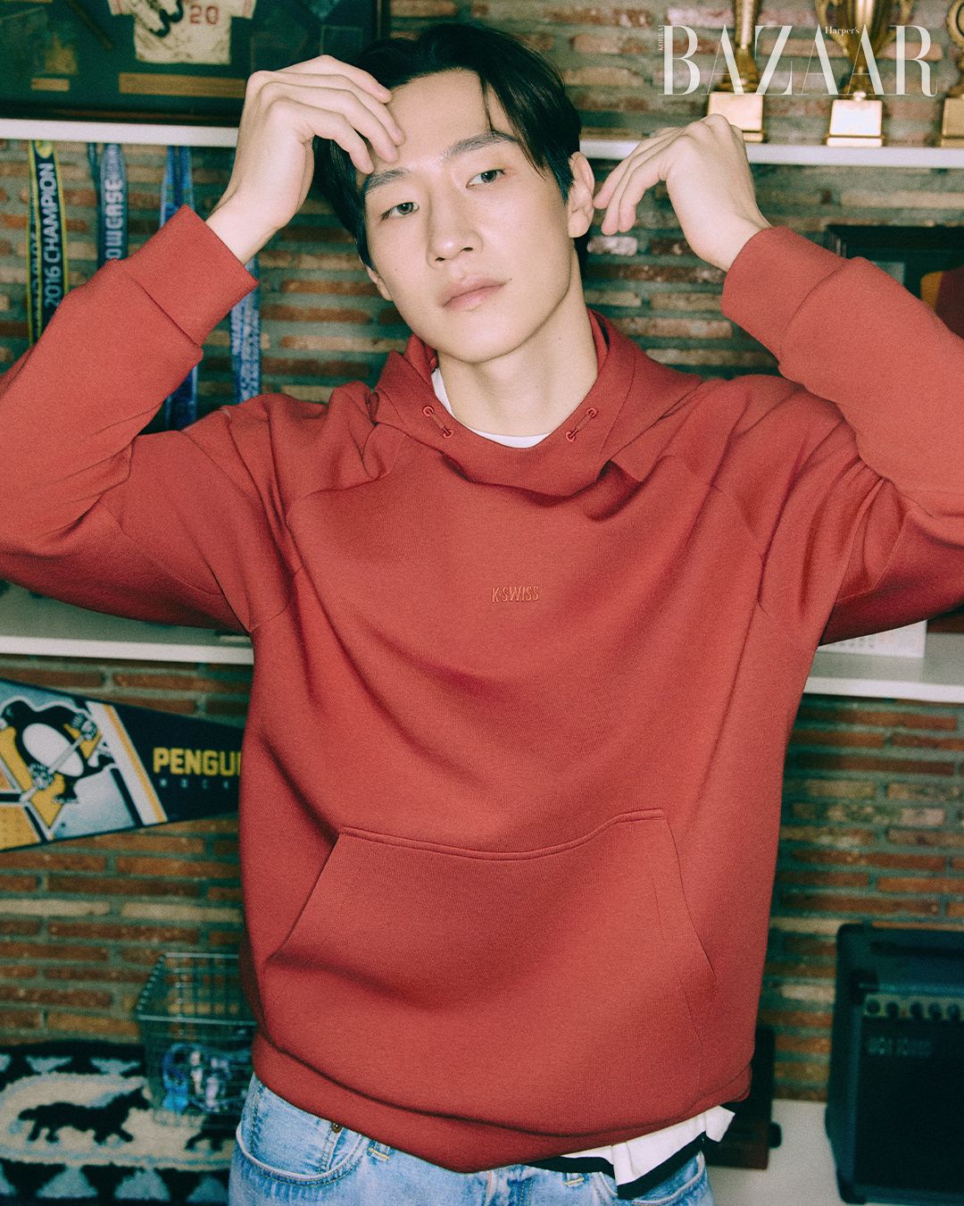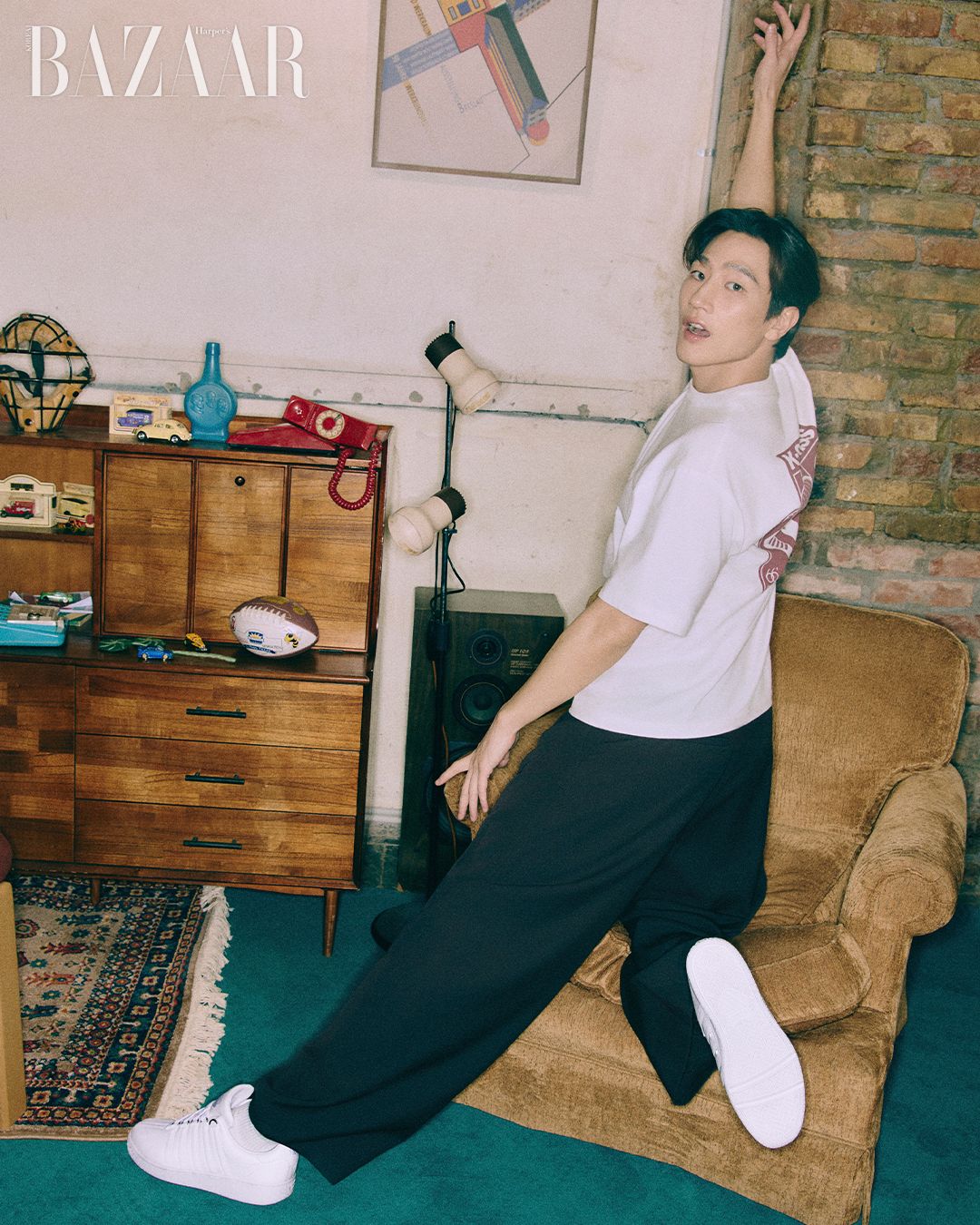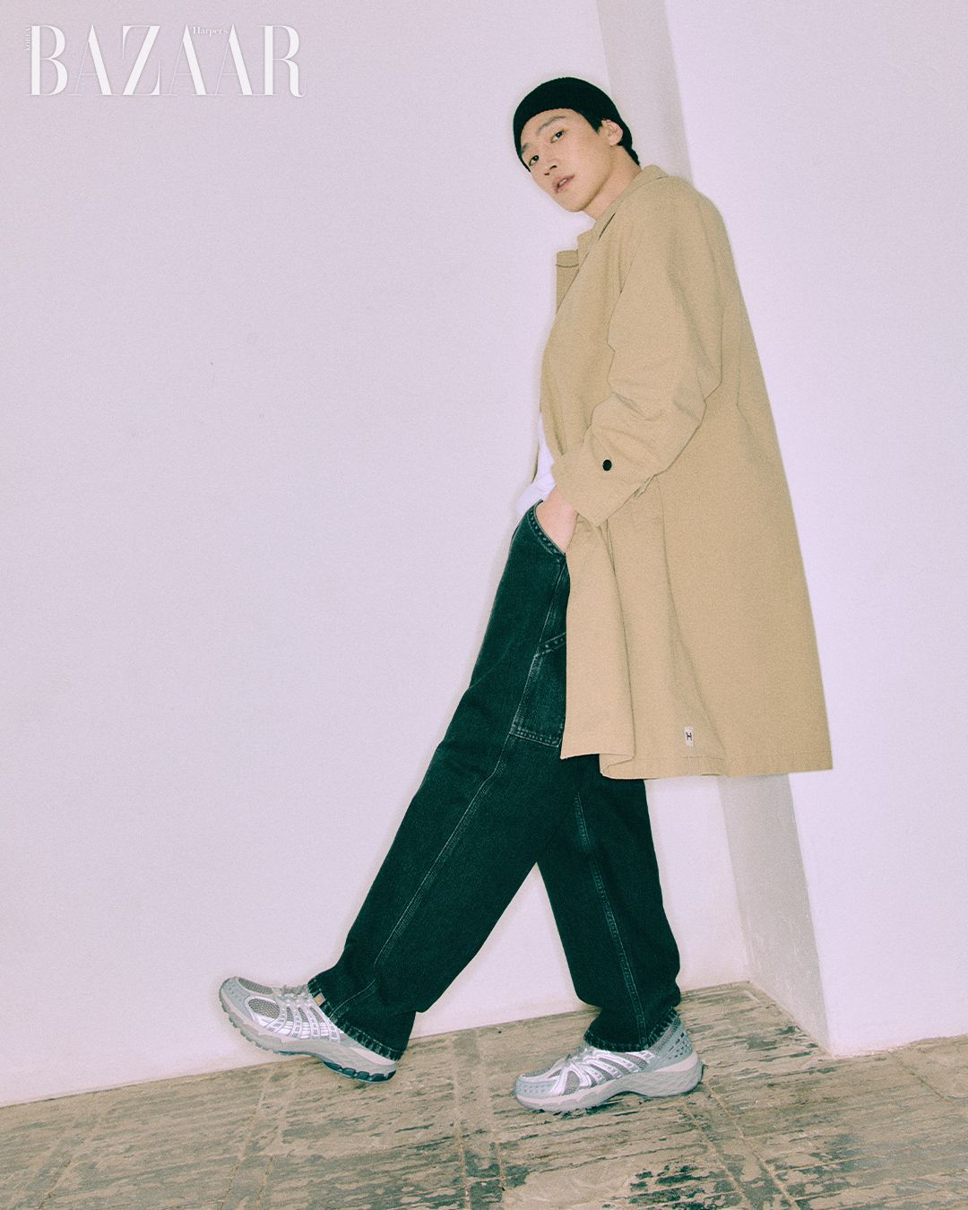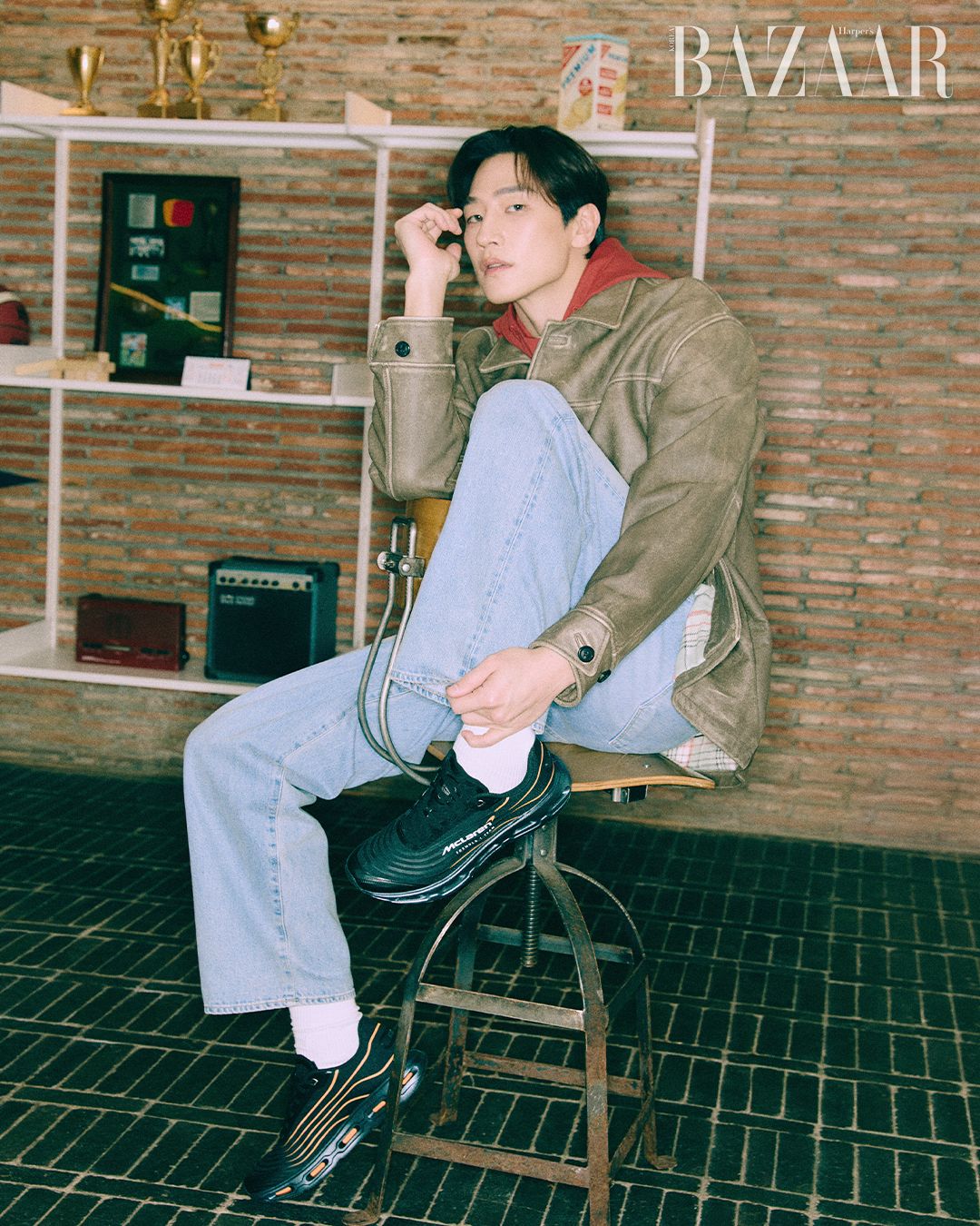 신발을 활용한 스타일링 화보로 8개의 룩을 들여다볼 수 있는데, 클래식한 테니스 슈즈부터 스포티한 디자인의 스니커즈까지 다양한 케이스위스 아이템을 활용해 웨어러블하면서도 트렌디한 룩을 완성한 것. 특히 레더 재킷에 스니커즈를 매치하거나, 집업 형태의 윈드브레이커에 조거 팬츠를 조합한 올 블랙의 세미 고프코어 무드를 연출할 때는 실용적인 ‘꾸안꾸’ 스타일링 팁을 제안하기도 했다. 이처럼 그는 데일리 룩부터 액티브한 애슬레저 룩까지 다양한 스타일을 자유자재로 소화하며 특유의 부드러운 카리스마로 촬영 현장의 분위기를 주도했다.