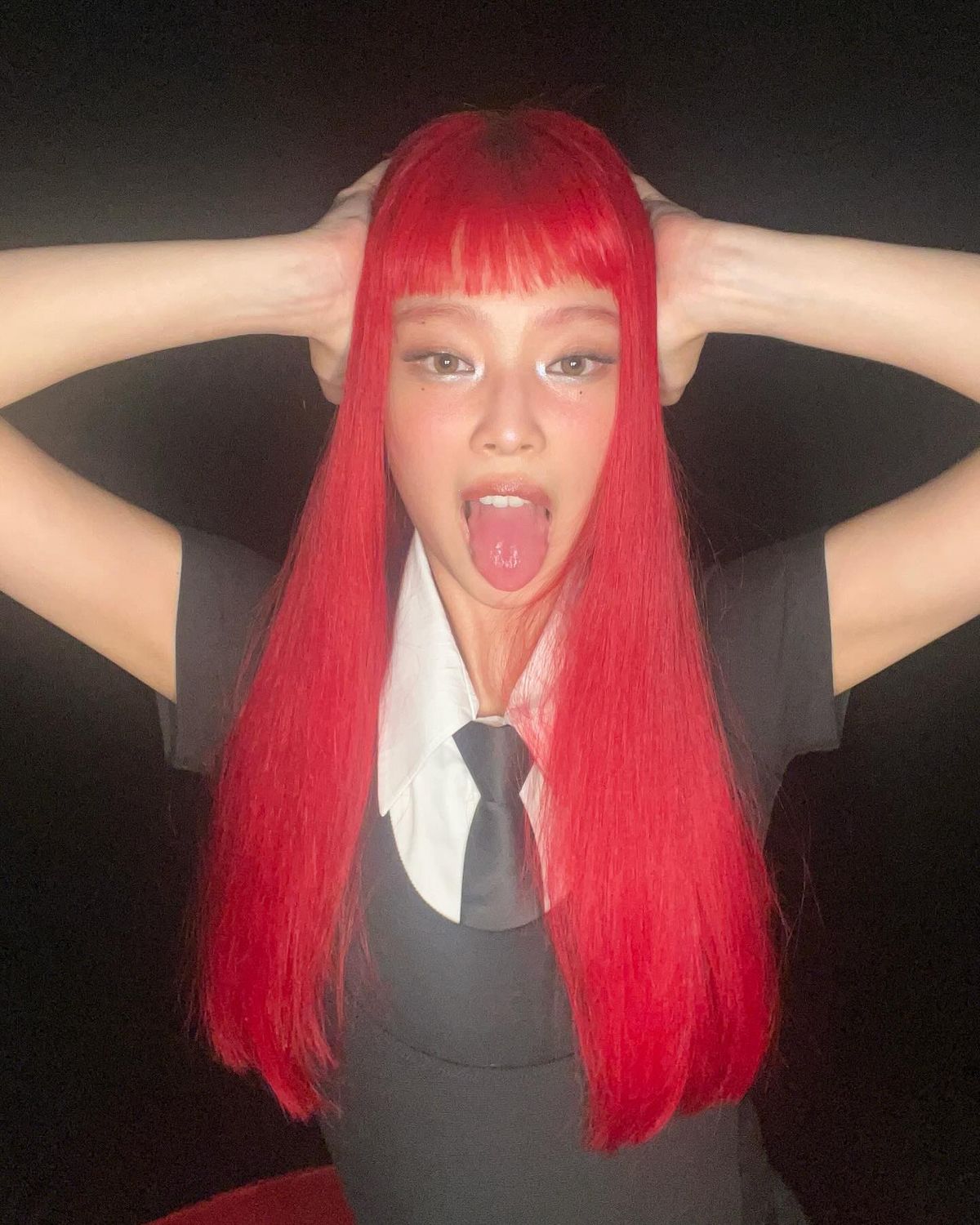 제니의 퍼스널 컬러는 레드? 제니 첫 솔로 정규 앨범 <Ruby>를 발표하며 헤어조차 강렬한 루비 컬러로 돌아온 제니. 풀뱅 헤어에 새빨간 레드 컬러, 붉게 물든 볼, 레드 립까지 어우러져 파격적인 스타일링을 선보인 것. 특유의 세련된 이미지가 어우러져 강렬하면서도 독보적인 존재감을 자랑한다. 역시, 제니!