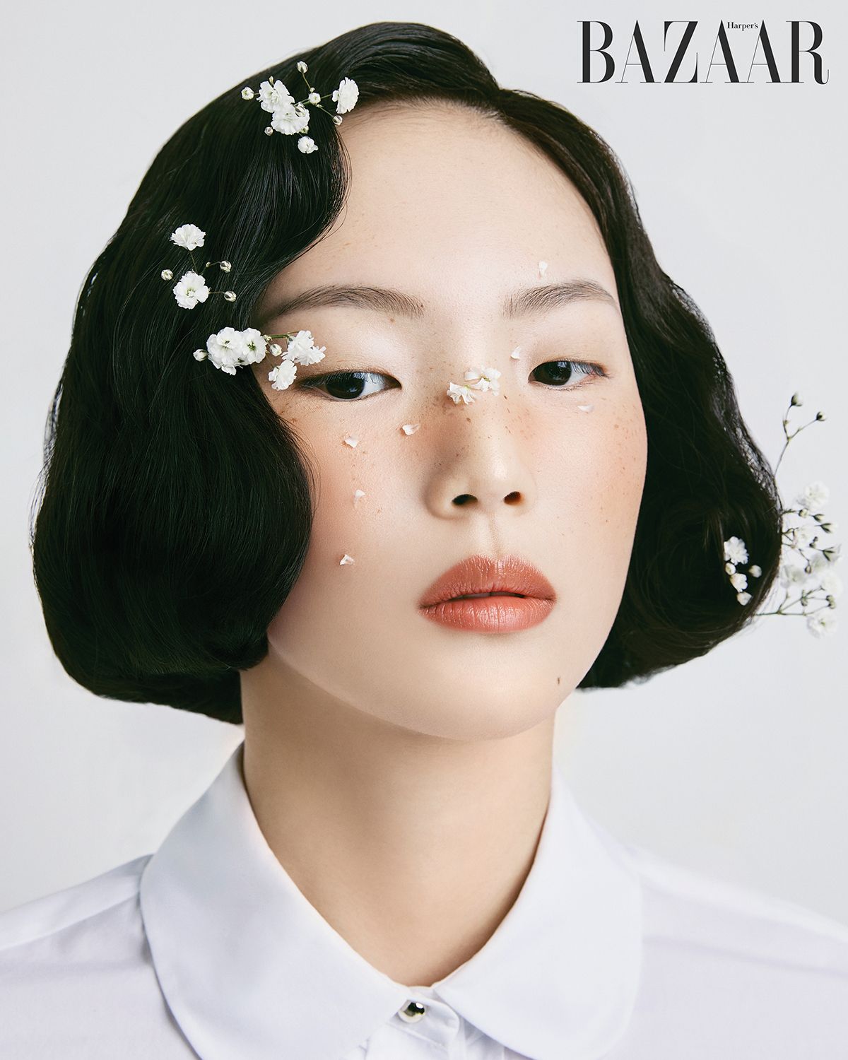 솜털이 살아 있는 보송한 피부의 핵심은 꼼꼼한 스킨케어! 완성 단계에서 메이크업이 들뜨거나 각질이 부각되지 않는다. 수분감이 풍부한 세럼과 크림으로 촉촉한 베이스를 만든 후 피부 결을 매끈하게 정돈해줄 프라이머를 사용한다. 상앗빛의 매트 파운데이션을 얇게 펴 바르고, 투명 파우더를 퍼프에 덜어 가볍게 눌러주듯 터치한다. 누드 베이지 컬러의 립스틱을 입술 전체에 발라 맑고 깨끗한 룩을 완성한다.