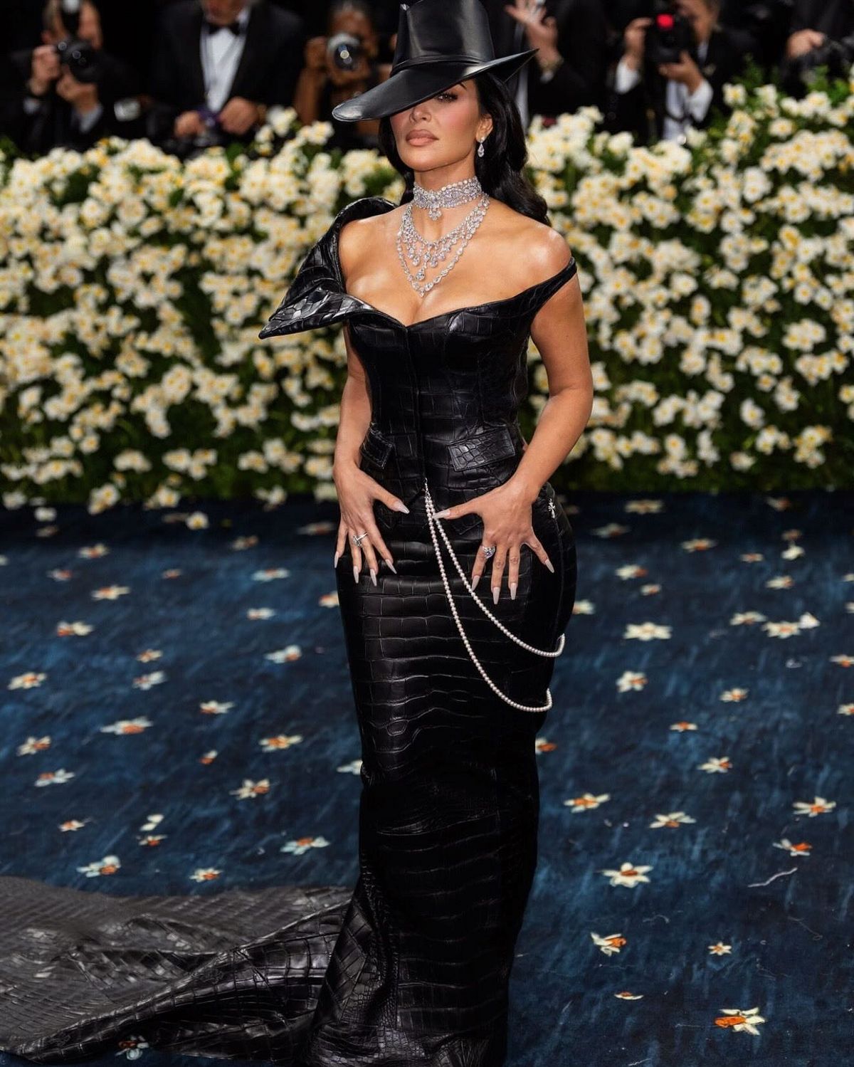 킴 카다시안은 테일러링을 누구보다 관능적이고 도발적인 해석을 통해 선보였다. 크롬 하츠의 커스텀 드레스를 입은 그녀는 블랙 악어 가죽 투피스 드레스를 착용했다. 비대칭 숄더 디테일의 톱과 길게 트레인이 늘어진 스커트는 모두 악어 가죽의 패턴으로 엠보싱 처리되어 더욱 도발적인 룩을 완성했다. 블랙 레더로 스타일링한 그녀의 룩을 빛나게 한 것은 겹겹이 레이어드 된 다이아몬드 목걸이들. 무사이프(Moussaieff)의 세 겹으로 겹쳐진 다이아몬드 초커를 착용한 그녀는 드롭형 귀고리와 반지까지 매치하여 자칫 매니시하게 해석될 수 있었던 룩을 화려하게 변모시켰다. 의상은 총 2,000 시간 동안 제작되었으며 45,000 개의 장식이 들어간 것으로 알려졌다.