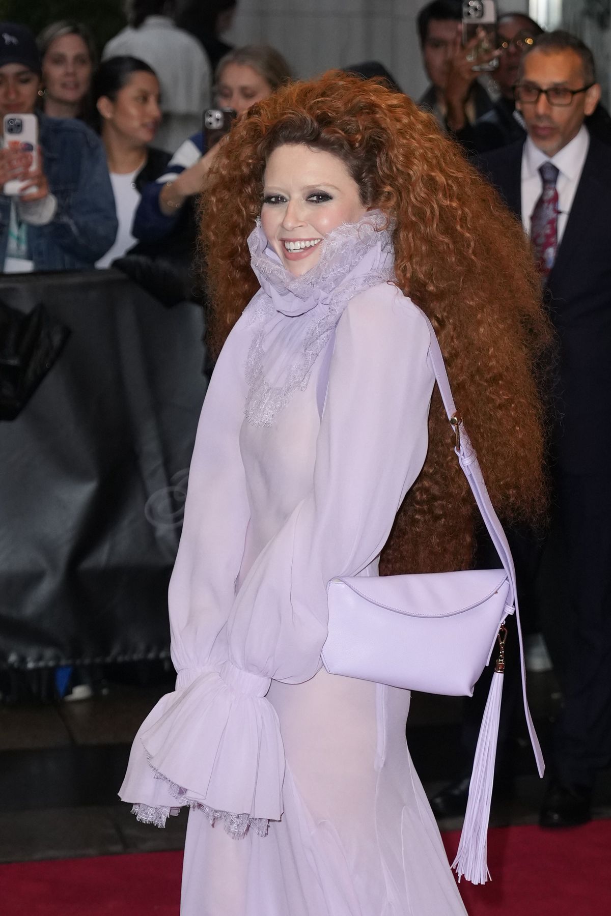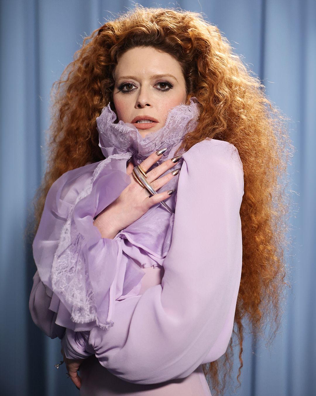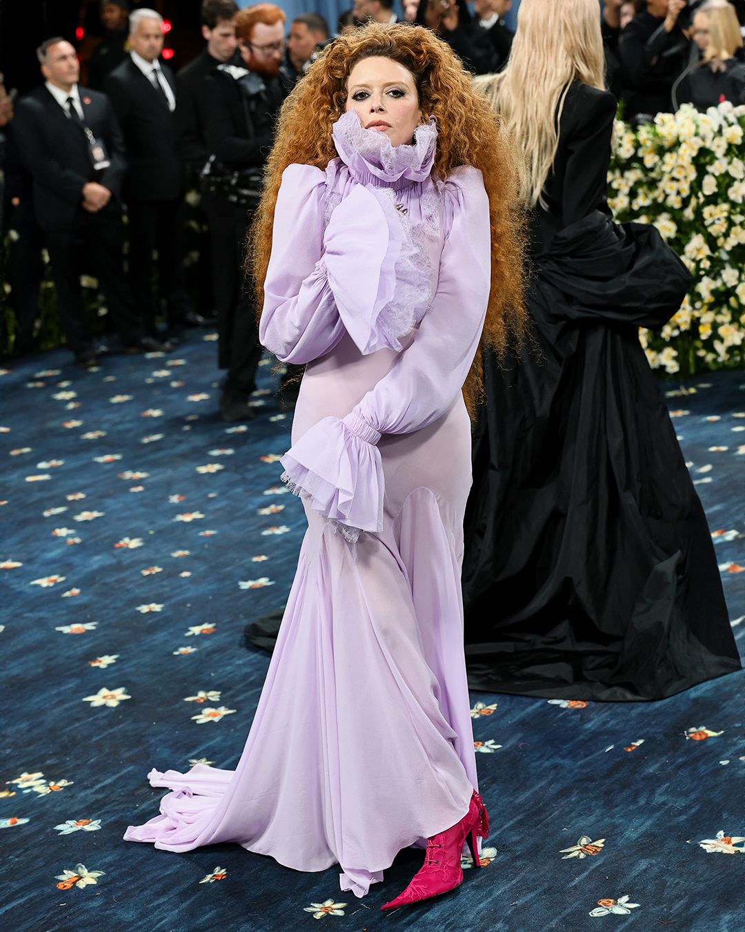 미국 배우이자 시나리오 작가, 감독, 프로듀서로 활약 중이 나타샤 리온은 사랑스러운 라일락 컬러의 실크 조젯과 플로럴 레이스가 비대칭으로 레이어링된 드레스를 입고 블루카펫에 등장해 시선을 끌었다. 하이넥 칼라와 셔링 커프스 디테일이 고전적인 실루엣을 강조하는 동시에 그의 극적인 표정과 어우러져 드라마를 만들어낸 것.