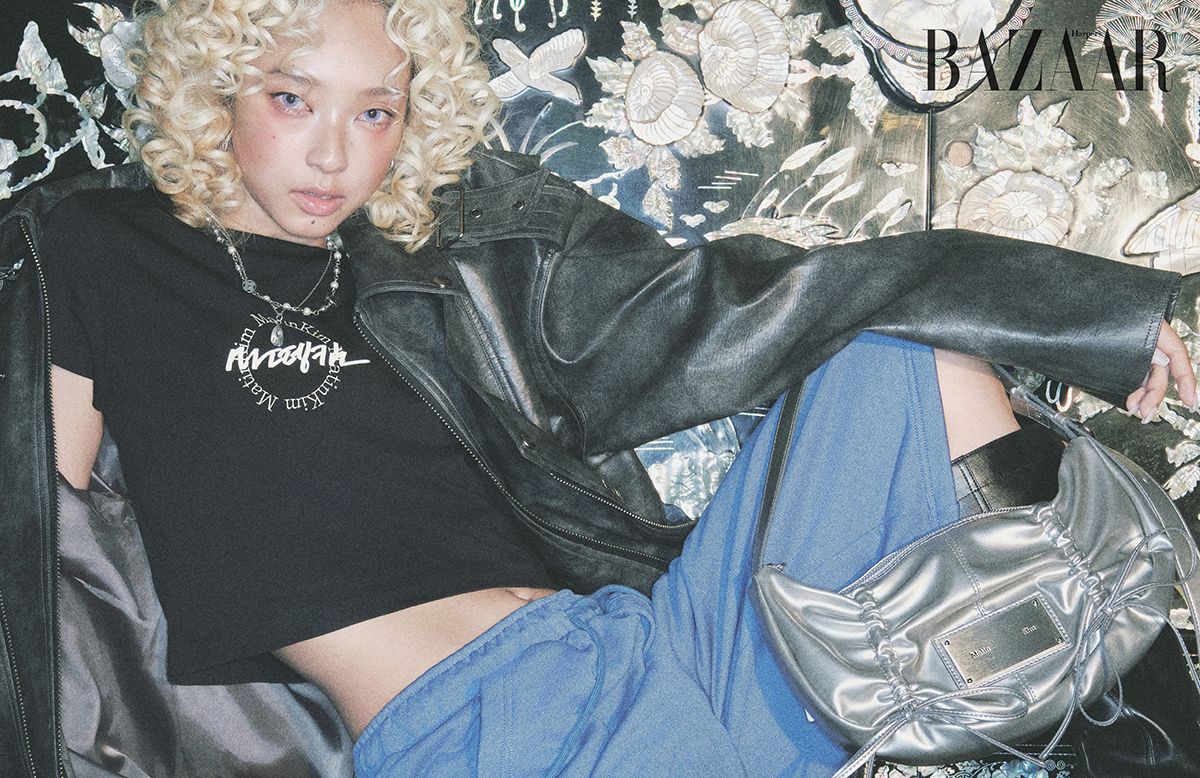 보머 재킷은 27만8천원, 티셔츠는 5만8천원, 데님 팬츠는 19만8천원, 벨트는 가격 미정 모두 Matin Kim. 목걸이는 에디터 소장품.
