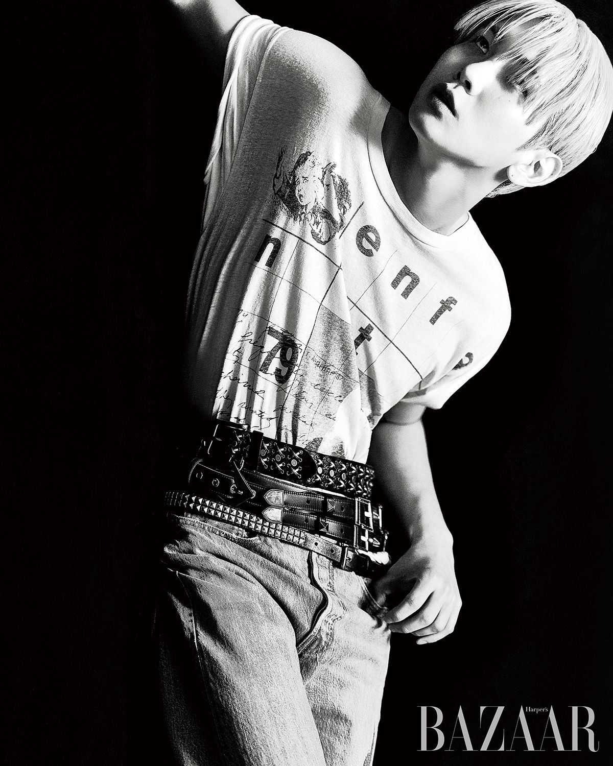 티셔츠는 Enfants Riches Deprimes. 데님 팬츠는 Levi’s. 벨트는 모두 Dem Project.