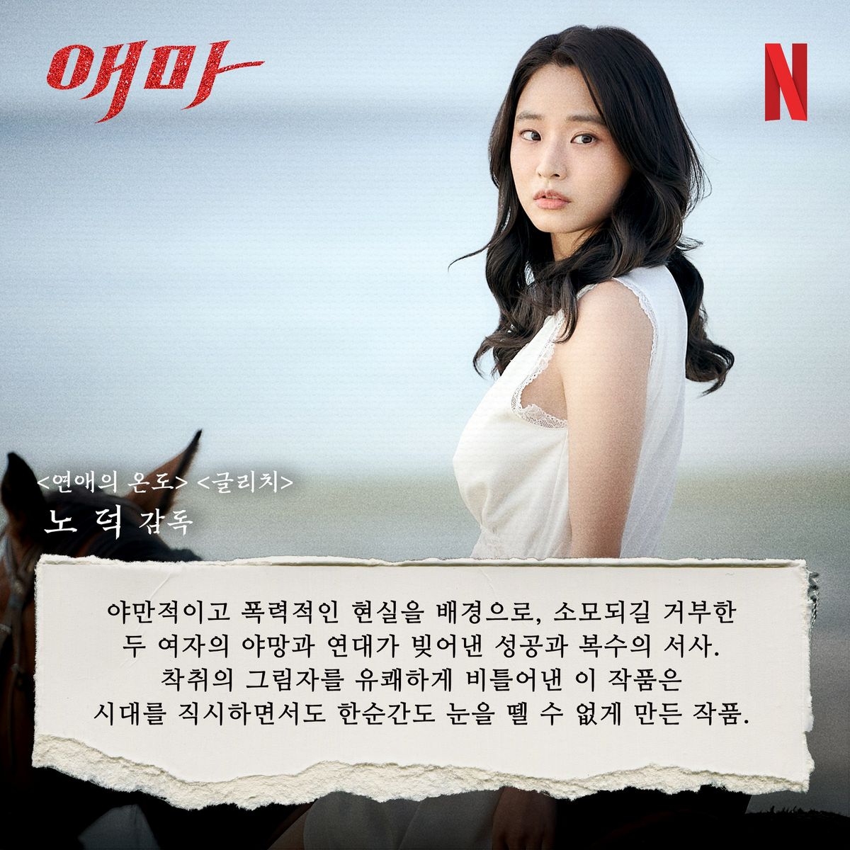 이 감독은 <천하장사 마돈나>(2006)로 청룡영화상 신인감독상과 백상예술대상 영화 시나리오상을 수상하며 주목받았고, 이후 <경성학교: 사라진 소녀들>(2015), <독전>(2018), <유령>(2023)까지 독창적인 세계관을 구축해왔다. 그런 그가 처음으로 시리즈물에 도전하며 꺼내든 이야기가 바로 <애마>다.