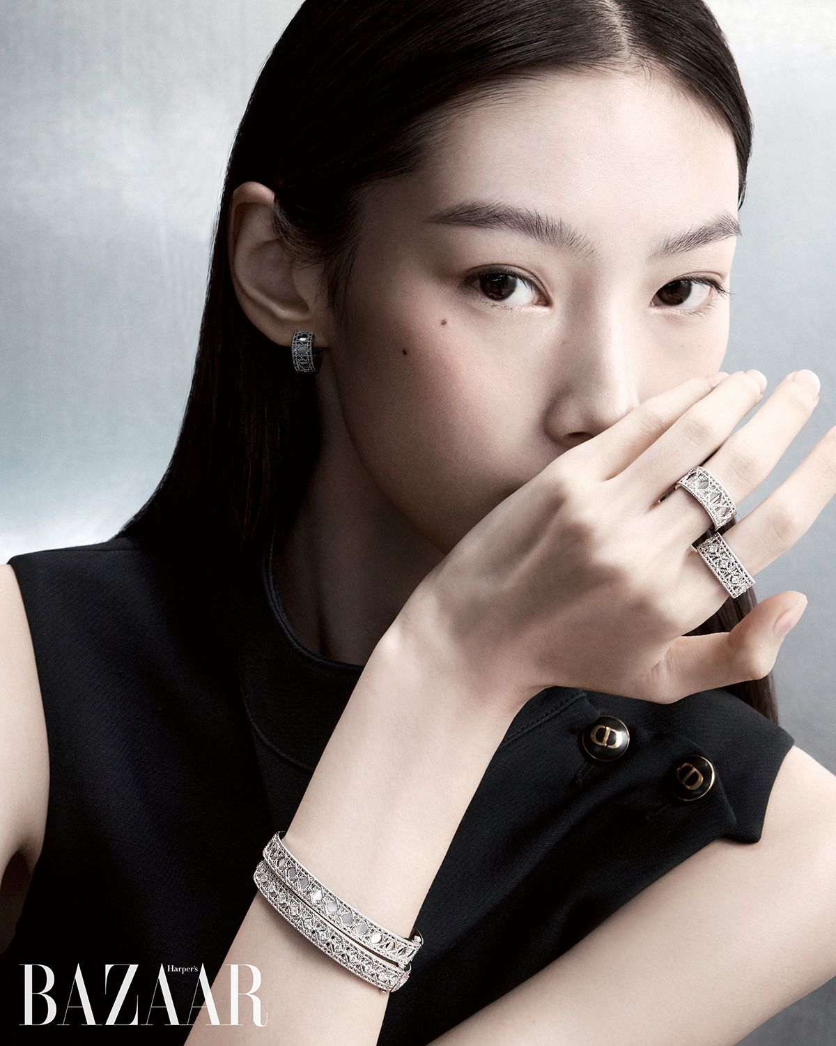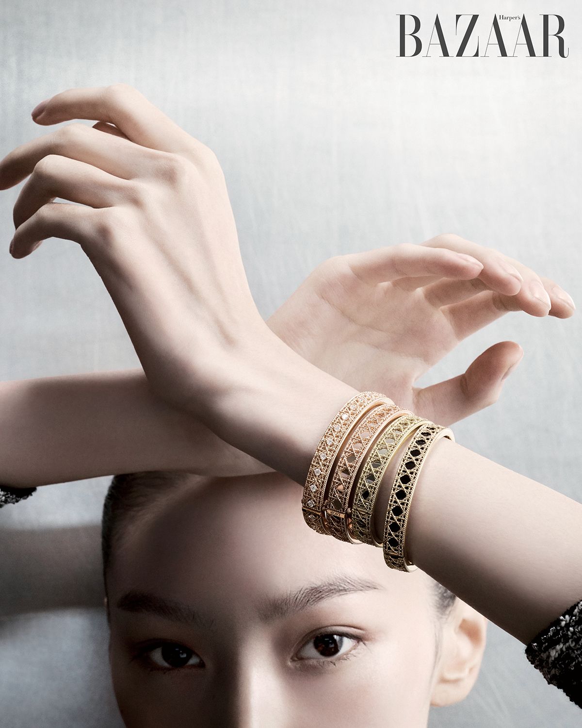 이어링, 중지와 검지에 착용한 링, 레이어링한 두 개의 브레이슬릿은 모두 ‘마이 디올’ 컬렉션 Dior Joaillerie.
