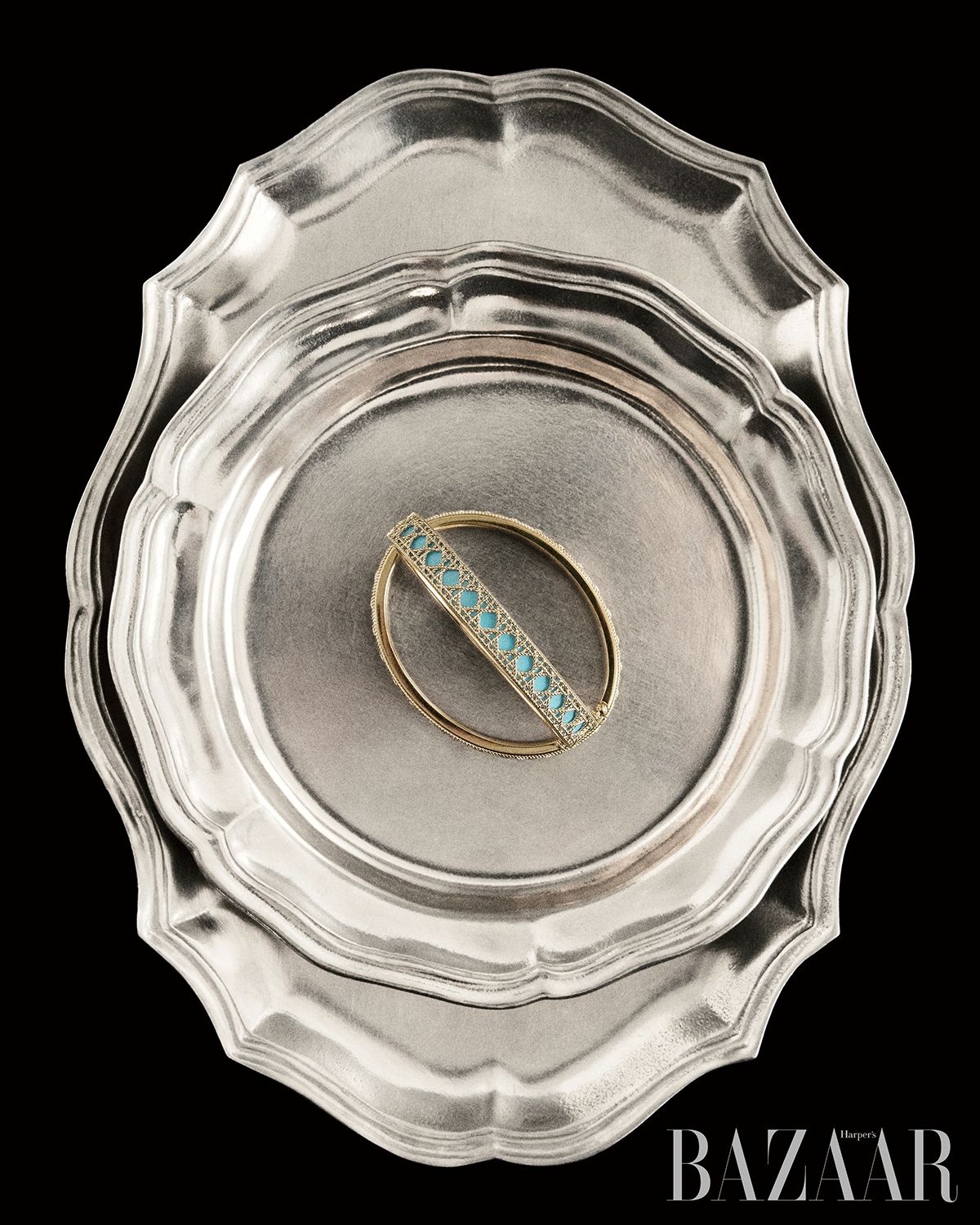 튀르쿠아즈 래커를 세팅한 브레이슬릿, 아래 놓인 화이트·옐로 골드 소재의 브레이슬릿은 ‘마이 디올’ 컬렉션 Dior Joaillerie. 두 개의 접시는 Cosi Tabellini.