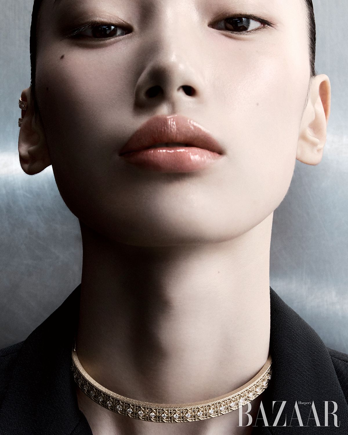 핑크 골드에 다이아몬드를 세팅한 이어커프, 까나쥬 패턴이 돋보이는 세 개의 링, 다이아몬드 장식의 초커는 모두 ‘마이 디올’ 컬렉션 Dior Joaillerie.