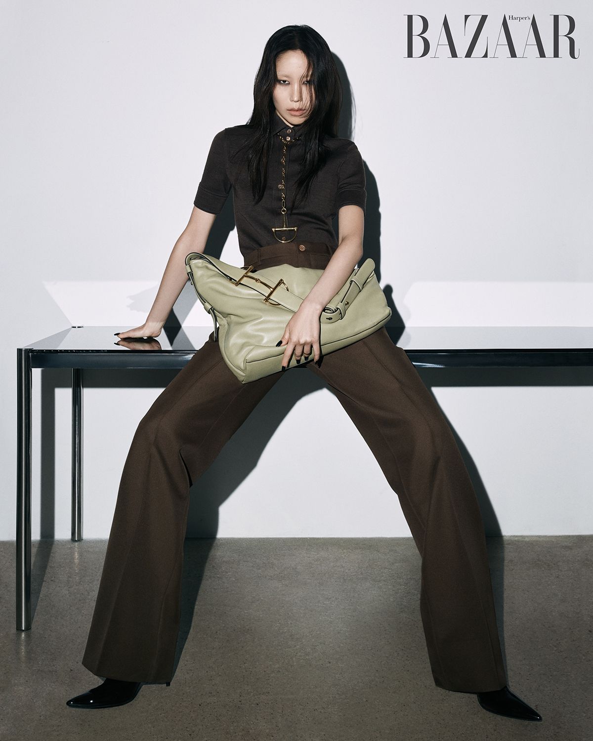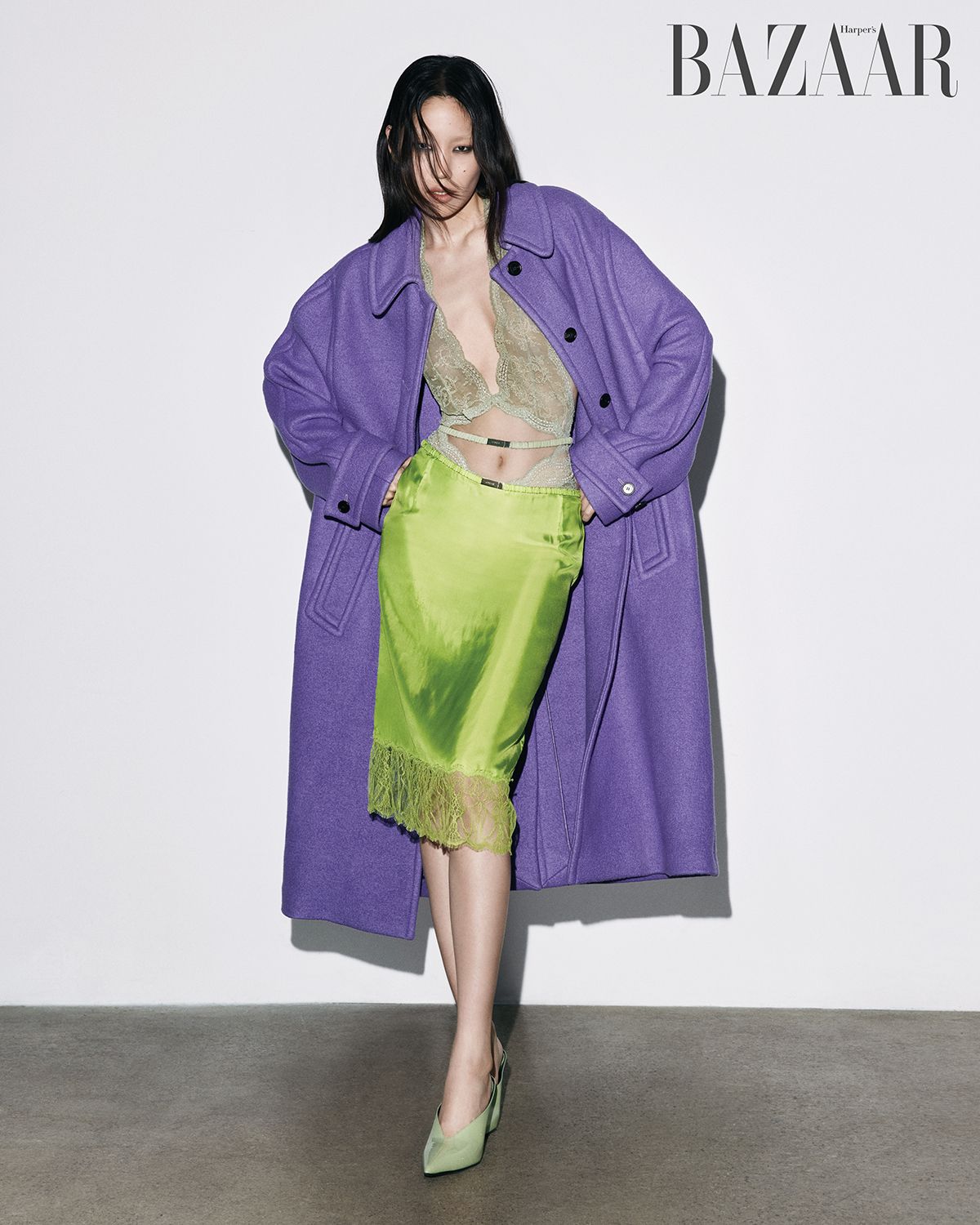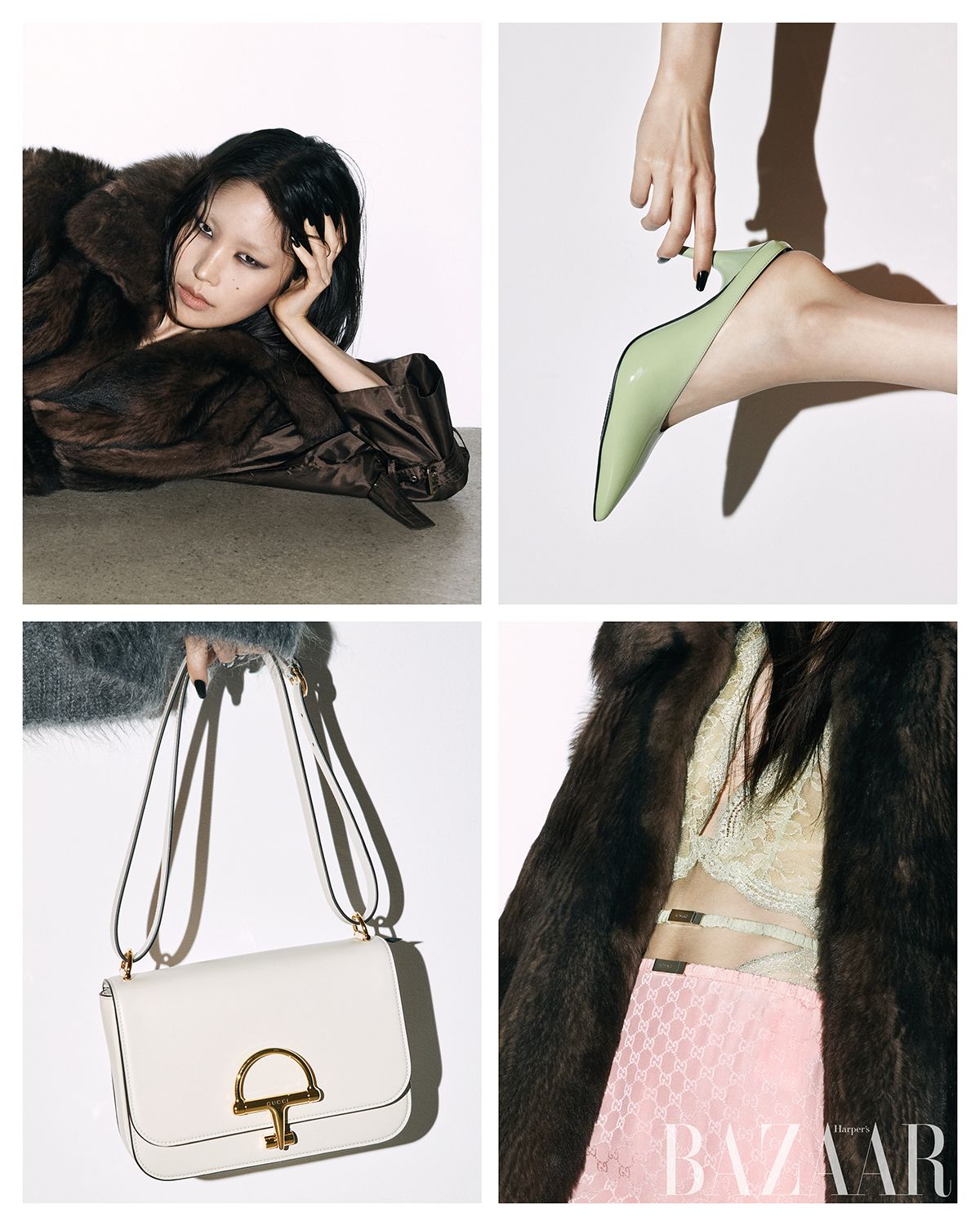 시어링 장식 트렌치코트는 2천5백만원대, 모헤어 카디건은 3백80만원, 레이스 보디수트는 3백60만원, 실크 스커트는 3백30만원, ‘구찌 시에나’ 숄더백은 5백50만원, 페이턴트 레더 뮬은 1백53만원 모두 Gucci.