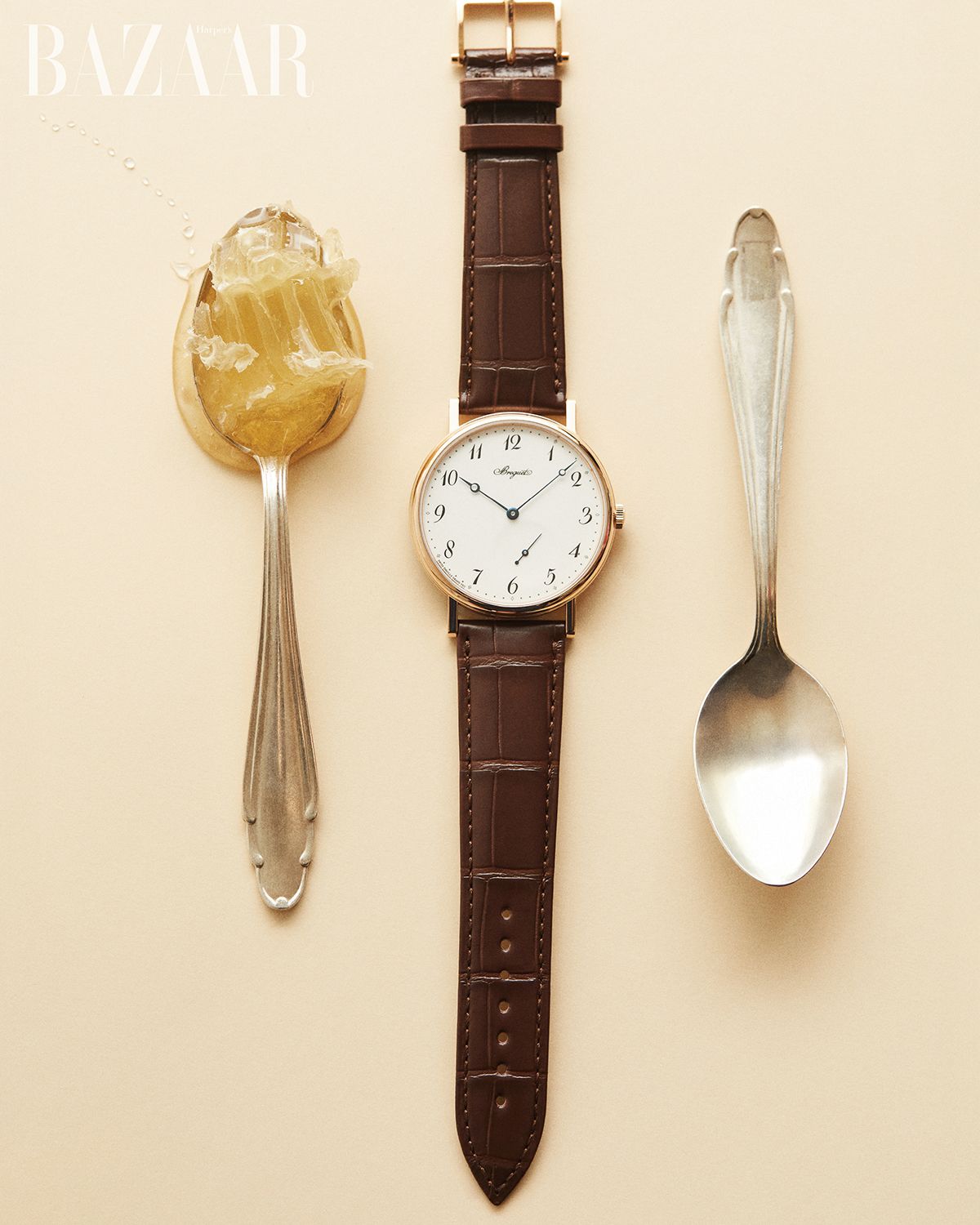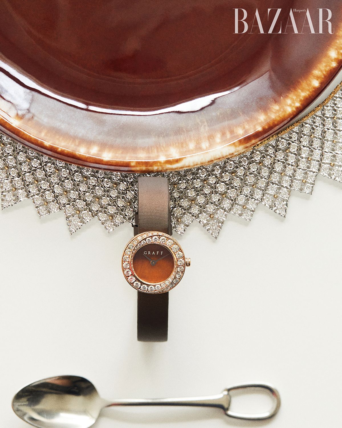 라운드 브릴리언트 컷 다이아몬드를 세팅한 옐로·화이트 골드 ‘모자이코’ 네크리스는 Buccellati. 로즈 골드 베젤에 다이아몬드를 파베 세팅한 ‘스파이럴’ 워치는 4천3백만원대 Graff. 디저트 스푼은 Hermès.