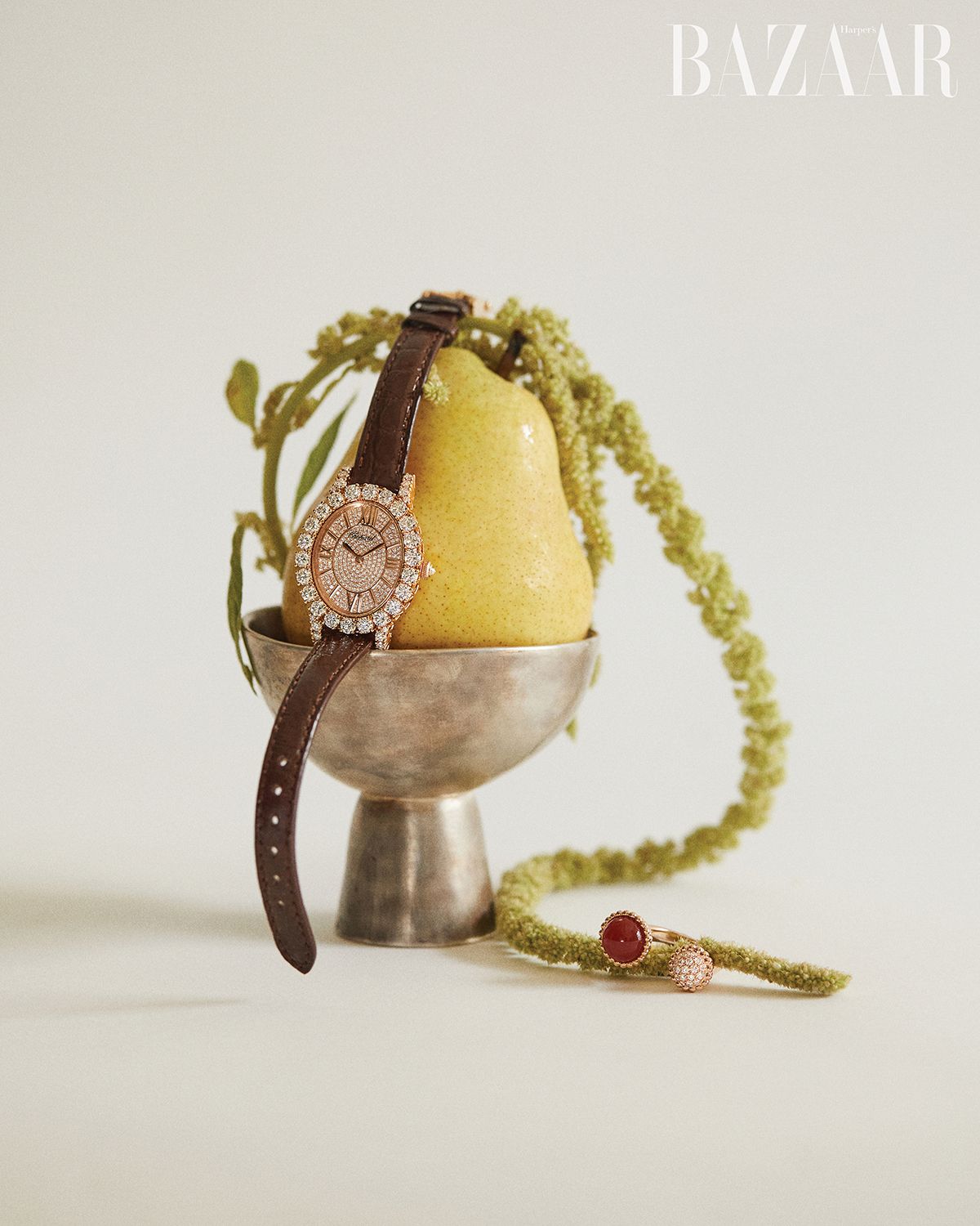 다이얼에 라운드 브릴리언트 컷 다이아몬드를 파베 세팅한 ‘디아망트’ 워치는 1억5천만원대 Chopard. 양끝에 각각 카닐리언과 다이아몬드를 장식한 ‘뻬를리 다이아몬드 듀오’ 링은 Van Cleef & Arpels.