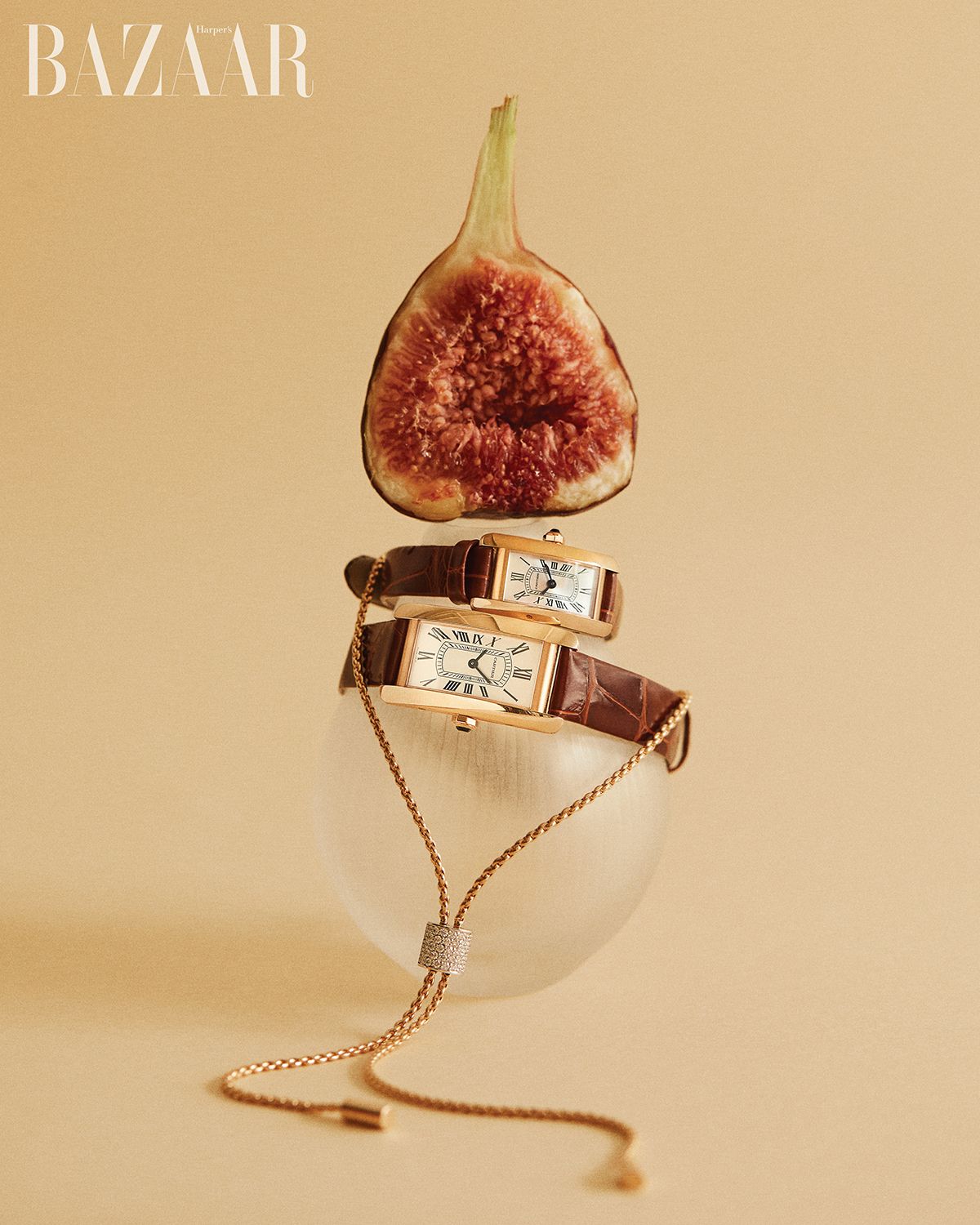(위부터) 다크 브라운 샤이니 앨리게이터 가죽 스트랩이 돋보이는 ‘탱크 아메리칸’ 미니 워치는 1천3백만원대, 핑크 골드 케이스에 쿼츠 무브먼트를 탑재한 ‘탱크 아메리칸’ 스몰 워치는 1천8백만원대 Cartier. 길이 조절이 가능한 ‘아리아’ 슬라이더 네크리스는 1천9백만원대 Fope.
