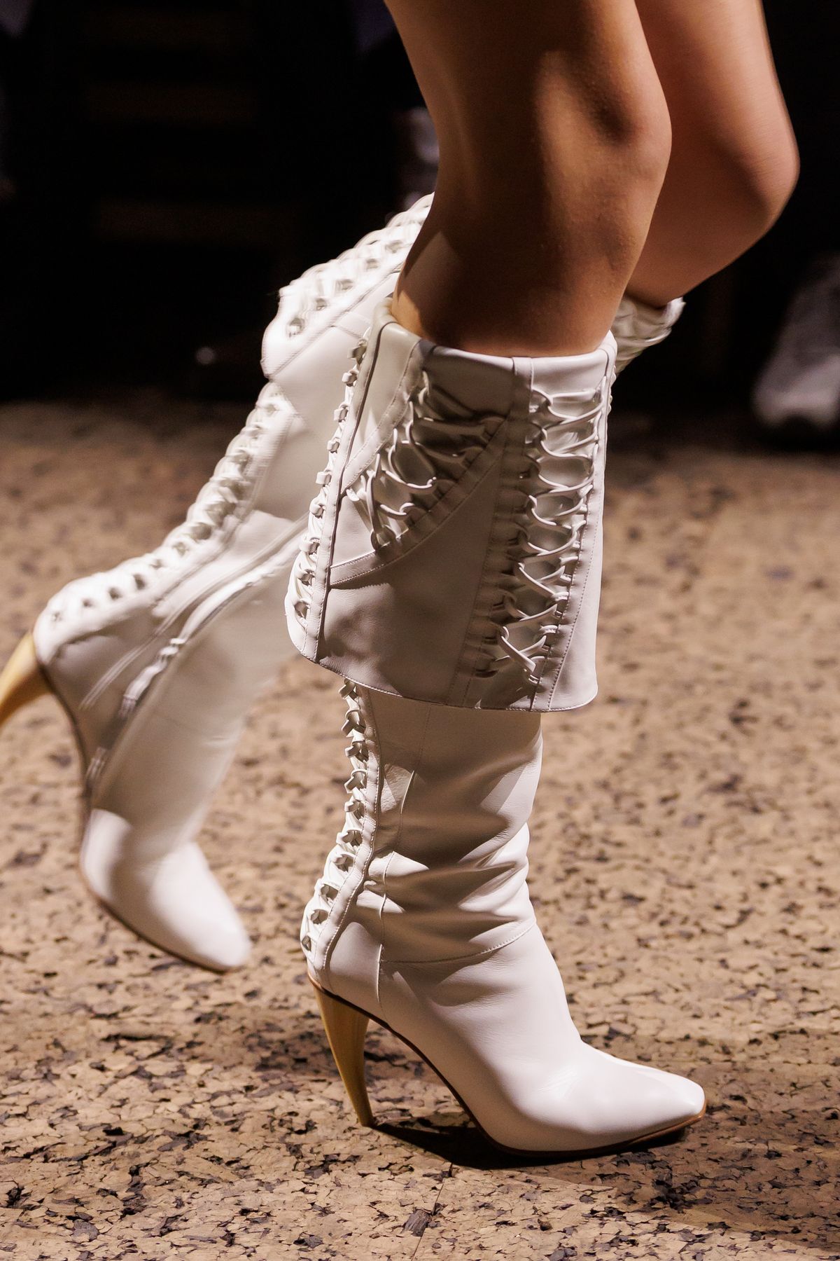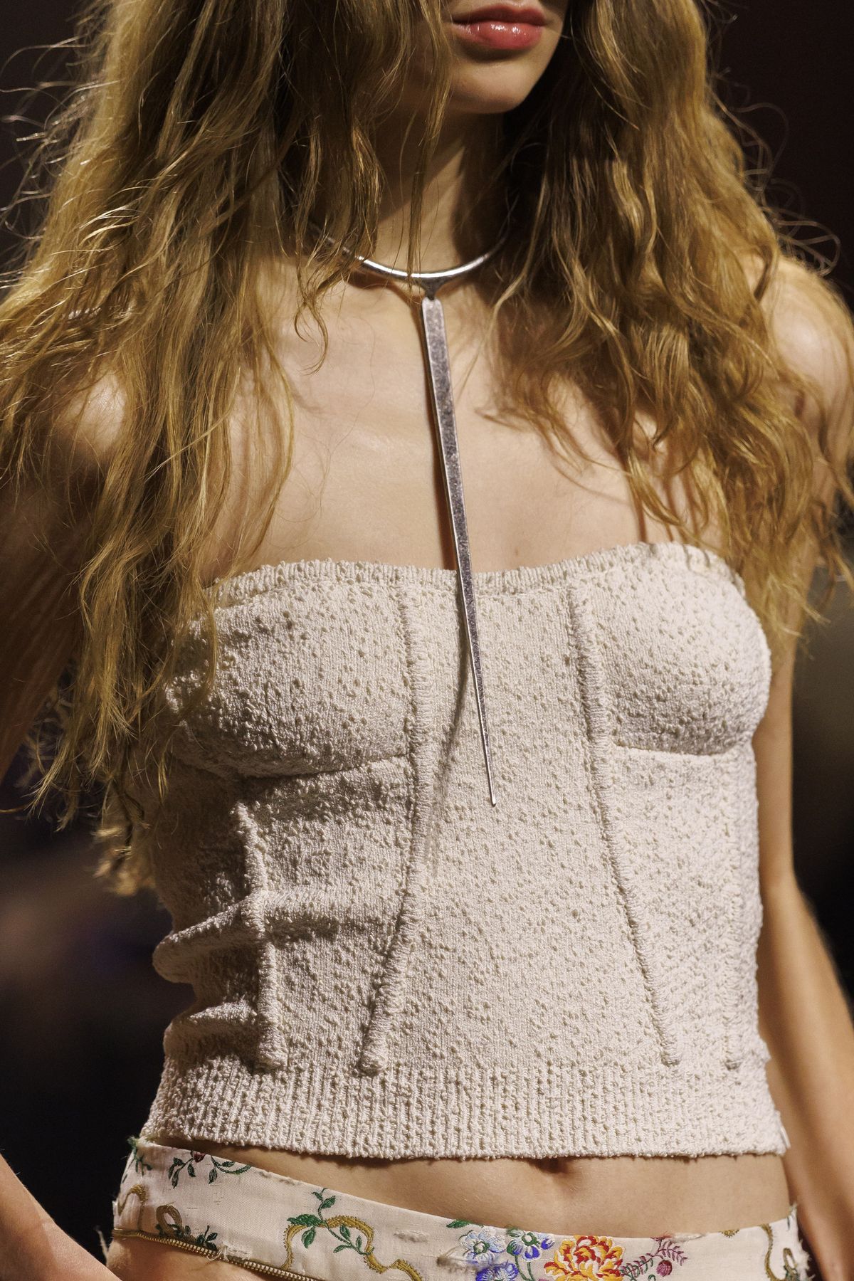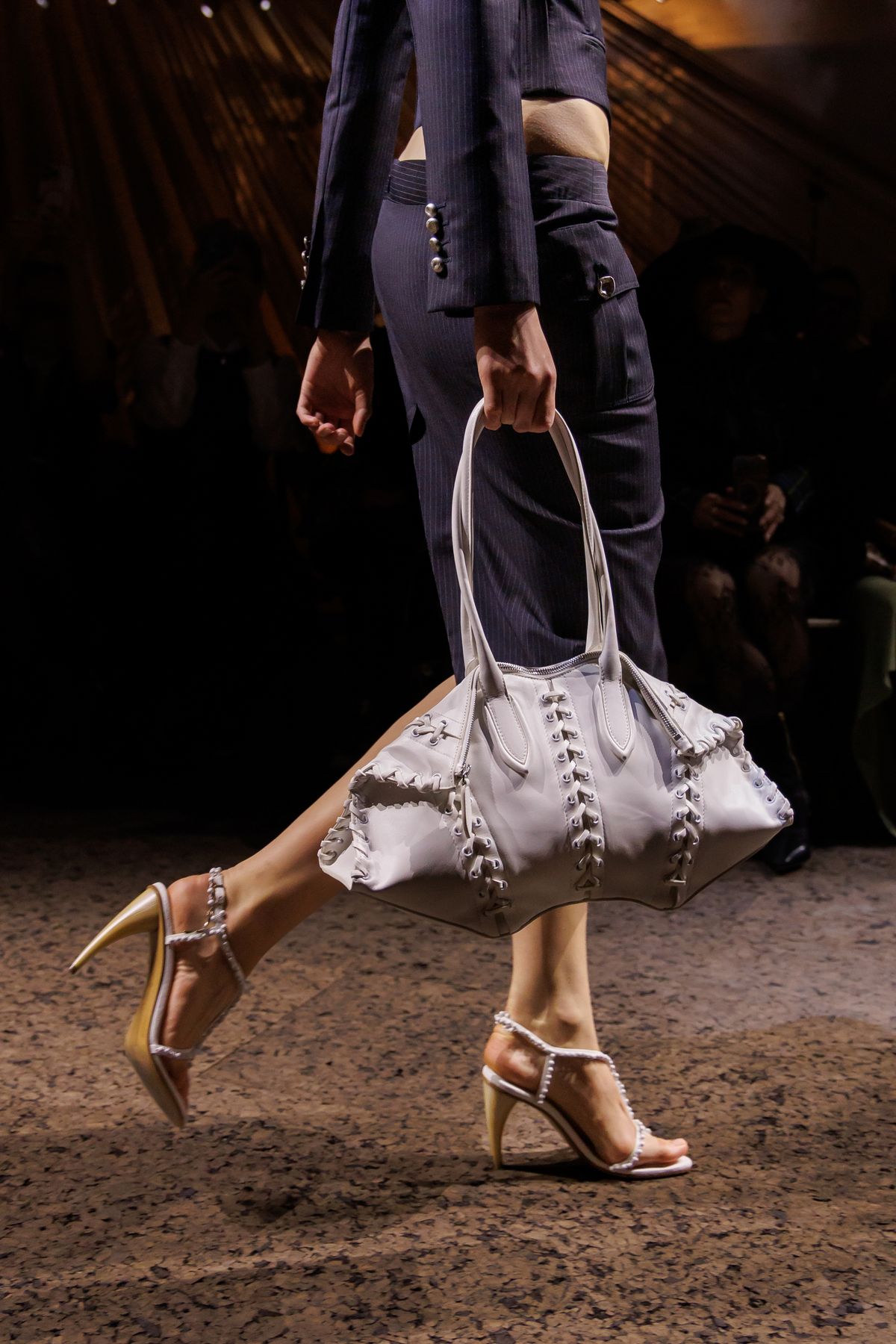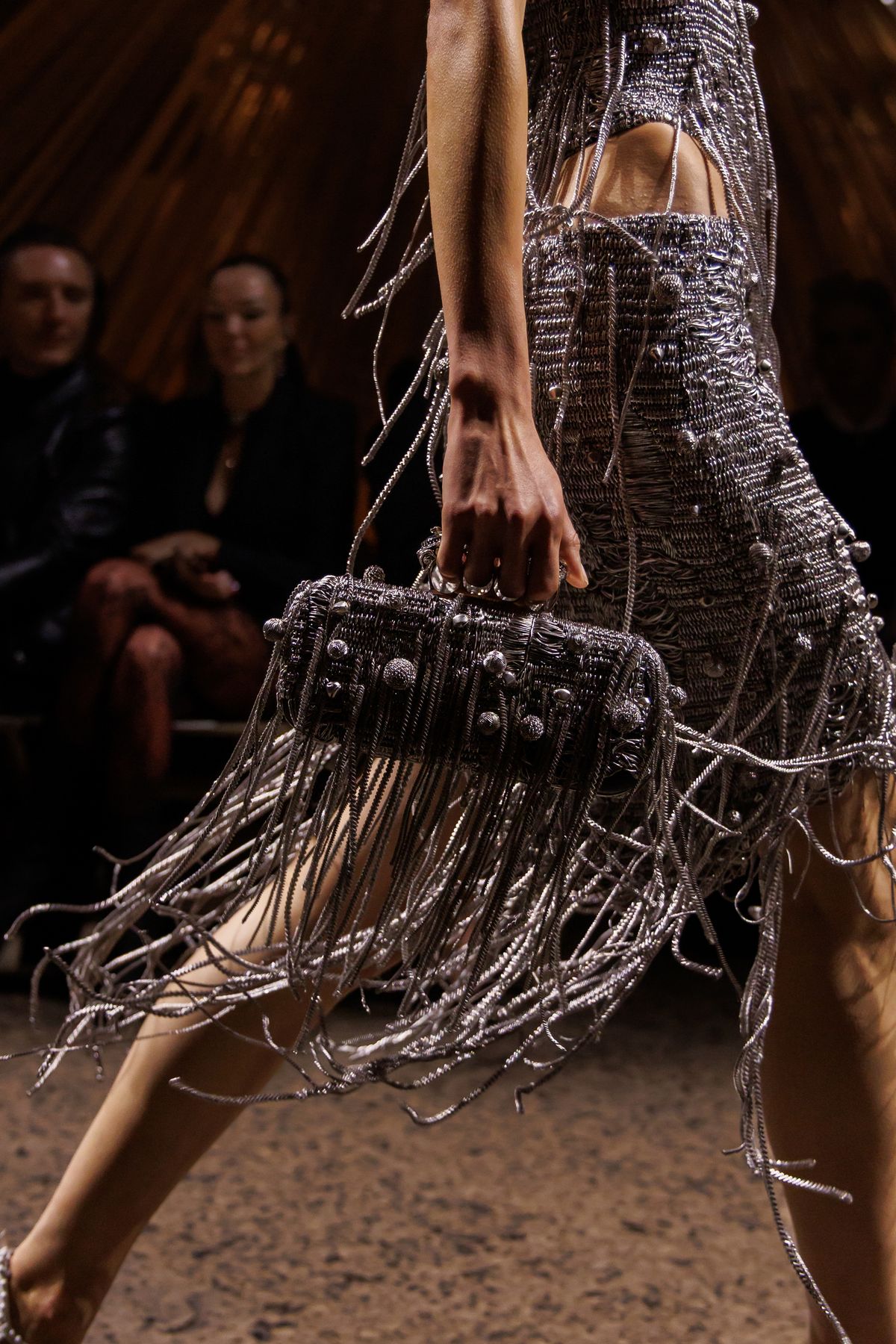 이 외에도 액세서리는 이번 시즌의 원초적 서사를 이어갔다. 진주조개, 나무, 부적 참이 달린 백은 고대적이면서도 현대적인 조형미를 품었고, 아카이브 ‘만타(Manta)’ 백은 기하학적인 곡선으로 재탄생했다. 불꽃 장식과 코르셋 레이스가 더해진 백, 매끄럽게 조각된 가죽 힐과 플로럴 자카드 부츠, 모두 본능과 질서의 이중성을 담아냈다. 주얼리 역시 가위, 곤충, 갈빗대 같은 모티프를 통해 자연의 형태를 조각하듯 표현했다. 강렬하지만 세밀한 리듬이 룩 전체를 완성했다.