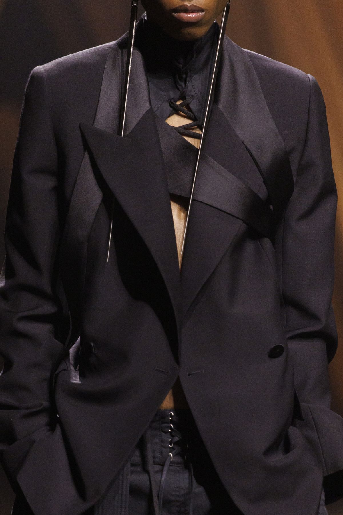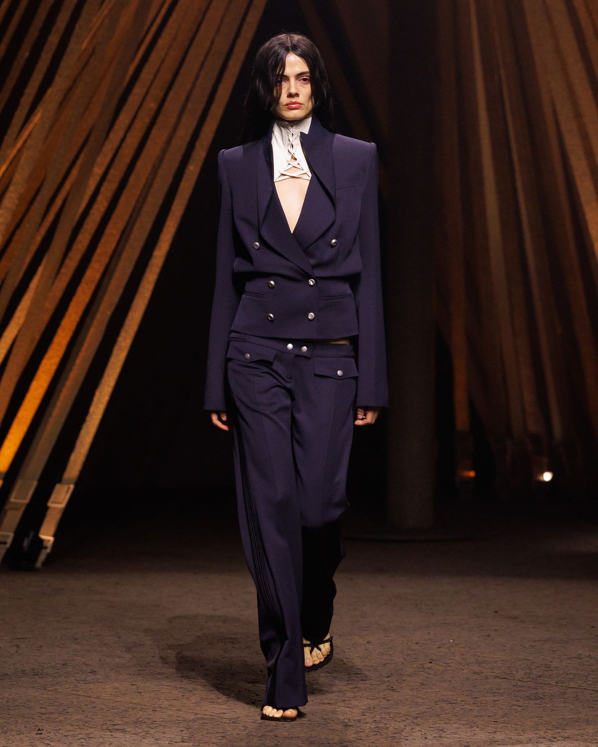 이번 시즌의 맥퀸은 제복을 해체하는 데에서 출발했다. 정교하게 재단한 재킷은 테일러링의 균형을 유지하면서 구조를 비틀었다. 비대칭으로 절개한 포켓, 제복 소재를 활용한 뷔스티에 드레스, 날카롭게 잘린 라펠까지. 하우스 특유의 테일러링 유산이 현대적으로 재구성됐다. 셔츠는 몸을 따라 조여졌고, 스커트와 팬츠는 낮게 걸쳐져 실루엣의 긴장을 만들었다. 특히 눈에 띈 건 극도로 낮은 로라이즈 범스터 팬츠. 신체의 윤곽을 강조해 인체의 유연한 움직임을 강렬하게 시각화한 모습이었다.