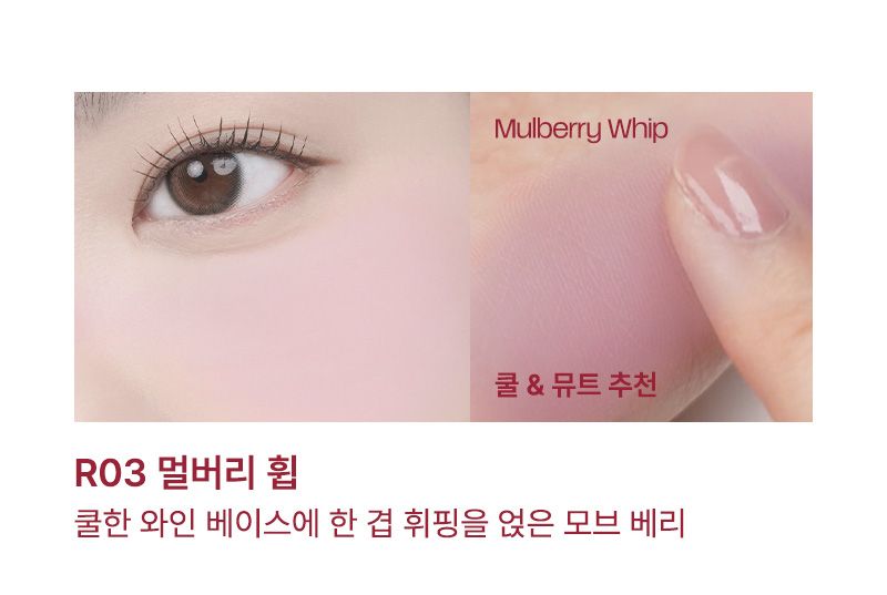 모공을 자연스럽게 커버해주는 '모공 블러' 블러셔. 탁한 모브 계열 컬러가 피부에 펴 발랐을 때 은은하고 분위기 있는 뮤트 톤으로 변하며, 깨끗하게 발색 된다. 가을 분위기에 맞는 쿨톤 블러셔를 찾는 이들이라면 팁토우 블러셔의 멀버리 휩 컬러를 추천한다.