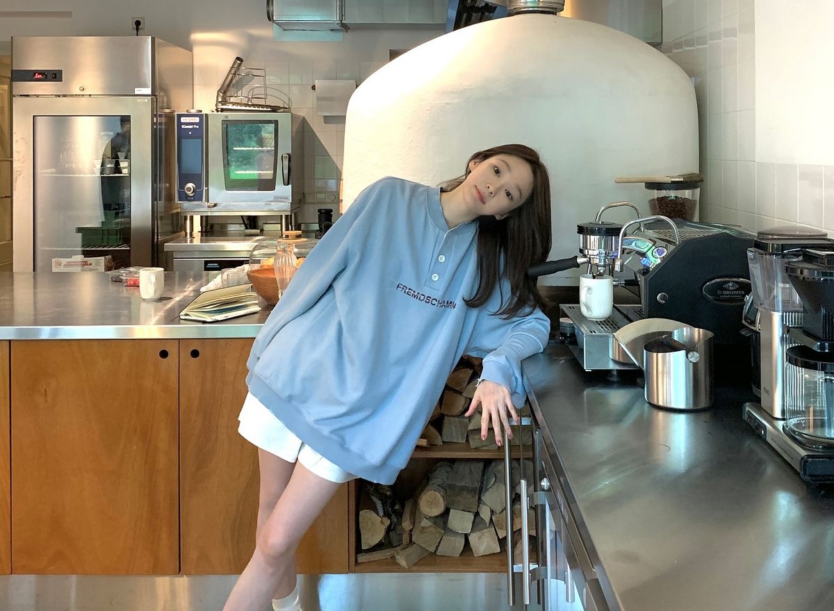헨리넥 디자인의 오버핏 스웨트셔츠를 입은 강민경 (출처: @iammingki)