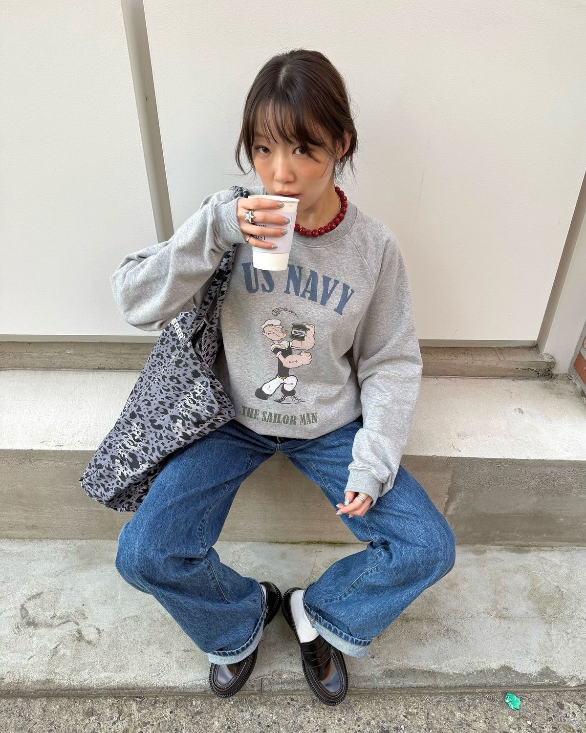 패션 크리에이터 잉화는 같은 디자인의 스웨트셔츠를 컬러만 달리해 두 가지 버전으로 스타일링했다. 귀여운 캐릭터 프린팅이 빈티지한 분위기를 만들어주며 룩의 포인트 역할을 한다. 시선을 사로잡는 레드 컬러 스웨트셔츠는 비슷한 레드 스트라이프 스커트와 매치해 경쾌한 무드를 더했다. 여기에 흰 양말과 로퍼로 귀여우면서도 장난기 있는 룩을 연출했다. 반면 그레이 스웨트셔츠는 여유로운 핏의 데님과 매치해 ‘기본의 힘’을 보여주는 코디를 완성했다. 데님 롤업과 레드 비즈 목걸이로 포인트를 주면, 나만의 작은 센스를 더한 데일리 룩으로 손색없다.