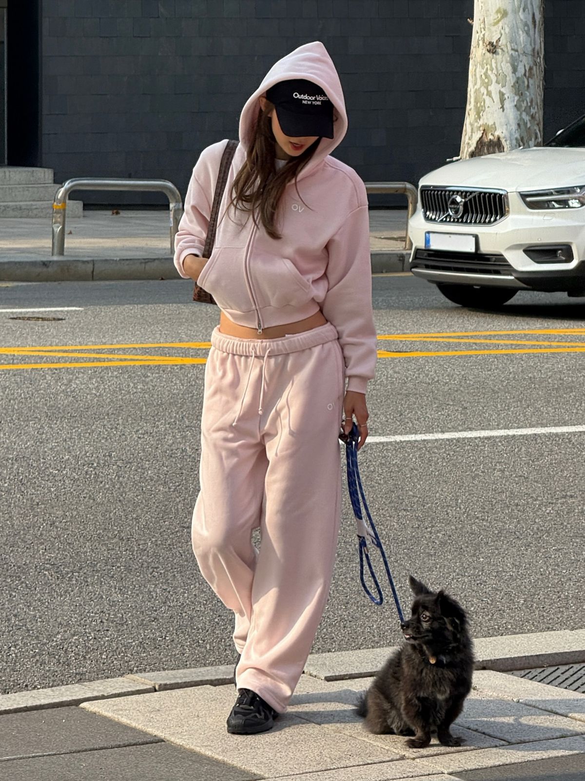 젤라비는 베이비 핑크 컬러의 크롭 후드 집업과 팬츠 셋업을 쿨한 무드로 소화했다. 푹 눌러쓴 볼캡과 함께 연출한 편안한 셋업은 마치 파파라치에게 포착된 헐리우드 스타를 연상시킨다. 무채색의 셋업은 자칫 단조로워 보일 수 있으니, 파스텔 톤 또는 비비드한 컬러의 셋업 제품을 추천한다. 팬츠의 허리선을 살짝 접어 연출하면 더욱 센스 있는 룩이 완성된다.