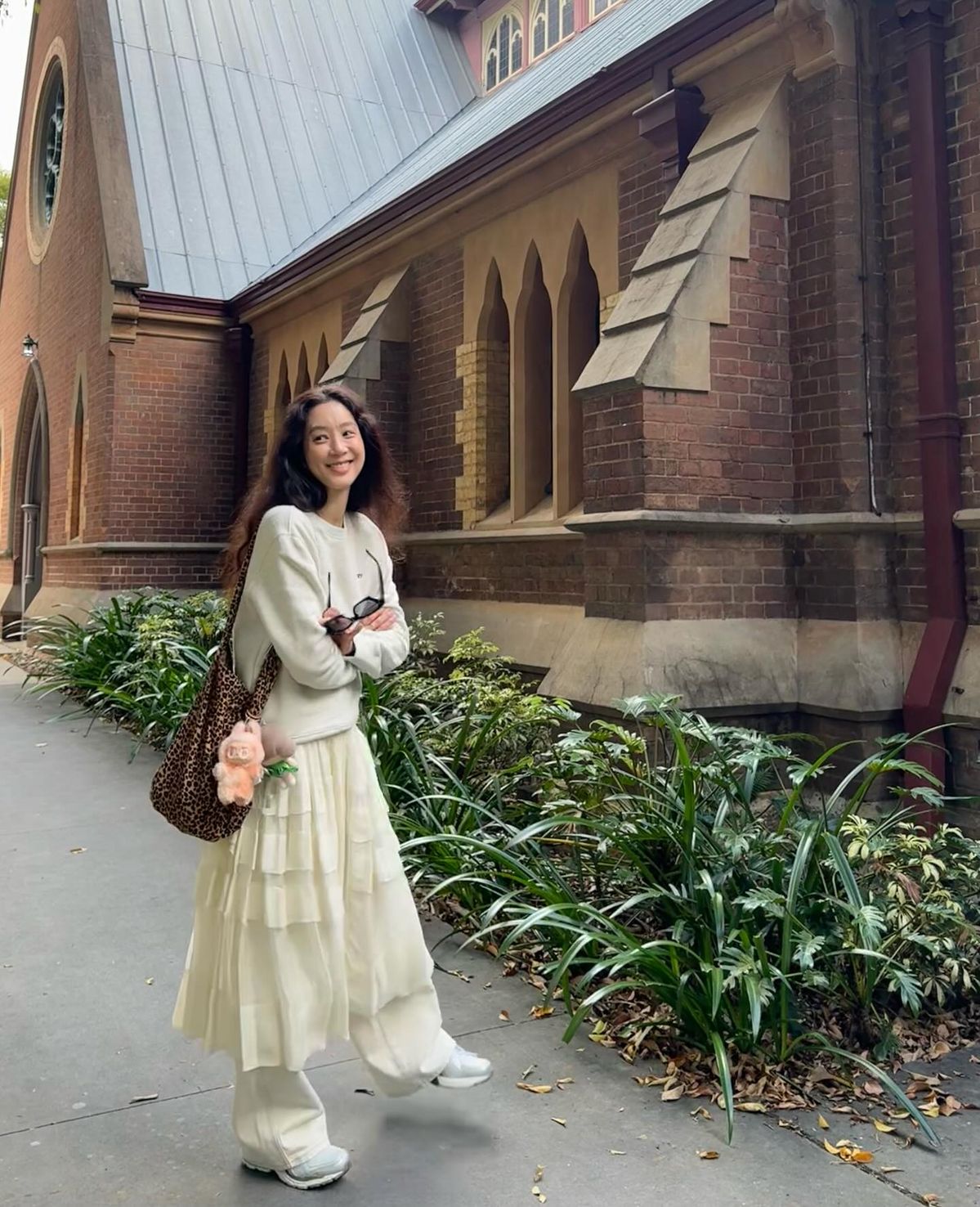 뉴트럴 톤온톤 조합은 스타일링 초보자도 도전할 만한 실패 없는 스타일링이다. 정려원은 오트밀 컬러의 스웨트셔츠를 아이보리 롱스커트, 팬츠를 레이어드한 하의 위에 매치했다. 사진 속 정려원처럼 상의부터 하의, 슈즈까지 컬러 톤을 통일하면 시각적으로 길어 보이는 효과까지 얻을 수 있다. 내추럴한 히피 펌 헤어와 러플 롱스커트가 만나 자유로운 분위기를 완성한다.
