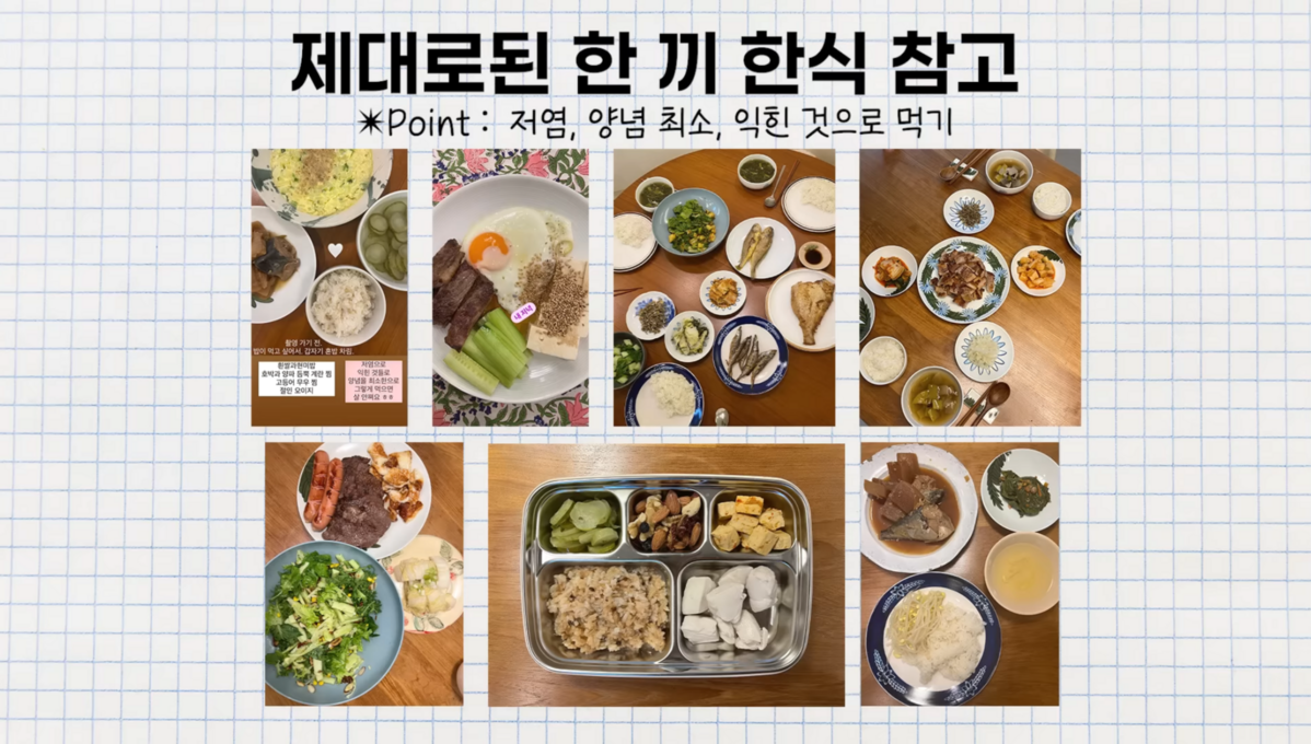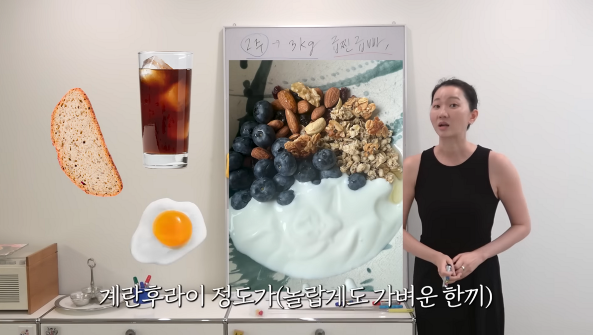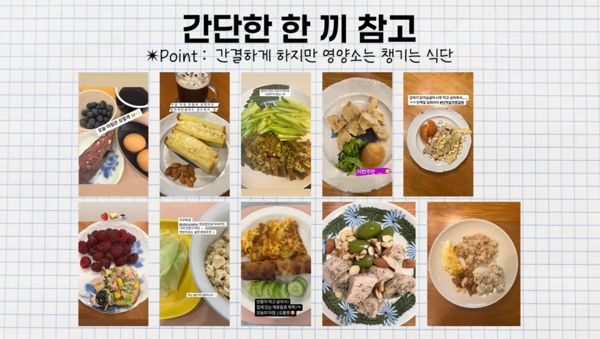 첫 끼는 가볍게, 두번째 끼니는 완전한 식사를 해주는 거다. 아침으로는 그릭 요거트, 그래놀라, 블루베리, 꿀, 달걀 등 탄수화물이 필요하다면 곡불빵 한 조각 정도. 대사에 부담이 없으면서 영양이 골고루 들어간 식사를 해주면 좋다. 저녁은 단백질 중심의 식단으로 꾸려주길 추천. 닭가슴살이나 연어구이 들 양념은 최소로 한 저염식의 익힌 것으로 먹는 식단으로 한식 위주로 먹는다고!