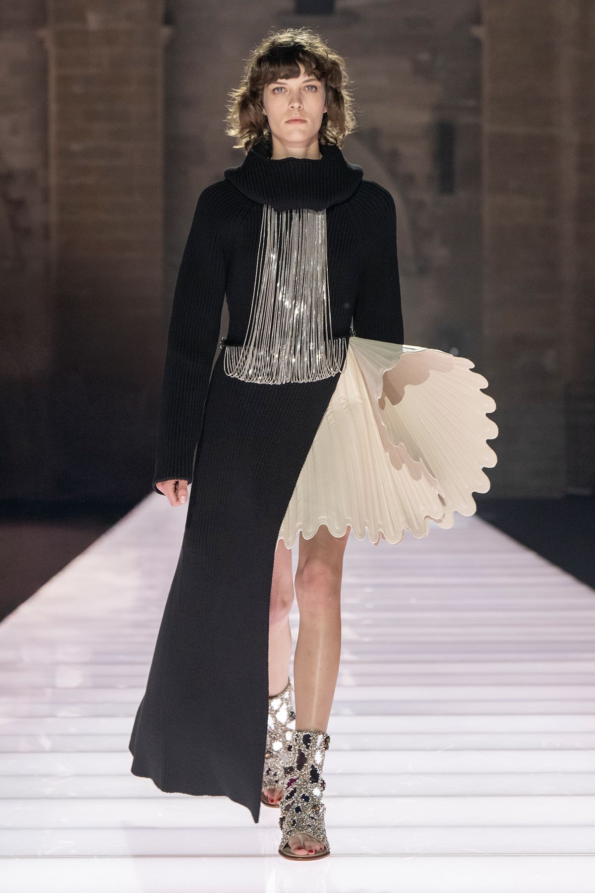컬렉션은 시간의 층위를 자유롭게 넘나들었다. 화려한 브로케이드 재킷은 시어링 장식으로 마무리되어 중세의 웅장함과 현대적 세련미를 동시에 품었고, 레그오브머튼 슬리브와 풍성한 셔츠는 과거의 형태를 빌려 미래적 실루엣을 그려냈다. 특히 표면 질감에 대한 실험은 촉각적 경험을 시각적 스펙터클로 승화시켰다. 발가락 부분이 절개된 보석 장식 부츠는 수많은 거울과 귀한 소재로 빛났고 블라우스는 섬세한 은빛 체인 실로 짜여 빛의 움직임에 따라 살아 숨 쉬었다.