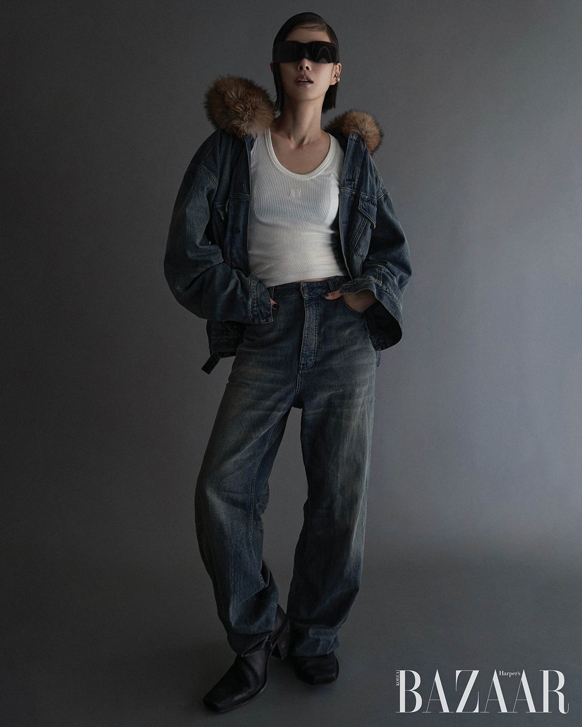 데님 재킷·팬츠 세트업, 선글라스, 부츠는 모두 Balenciaga. 탱크톱은 Loewe. 이어커프는 각각 11만원대 Portrait Report.